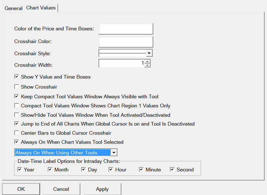 Attached is a screenshot showing how the Chart Values settings needs to be configured as you require. To get that particular tab select Global Settings >> Tool Settings >> Chart Values. Sierra Chart Support - Engineering Level  Your definitive source for support. Other responses are from users. Try to keep your questions brief and to the point. Be aware of support policy: https://www.sierrachart.com/index.php?l=PostingInformation.php#GeneralInformation For the most reliable, advanced, and zero cost futures order routing, *change* to the Teton service: Sierra Chart Teton Futures Order Routing  |