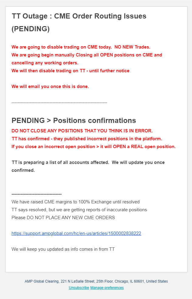 AMP sent the follow up email after suspending trading in my account, supposedly they updated my account to reflect the supposed CORRECT trades.... HOWEVER.... I was -8 short $MES going into 1pm. At 6pm reset it said I was -10 short. As of their update I am -3 Short. (All trades different averages). This means 2 extra short orders were placed on my account without knowledge, and then 7 buy orders were also placed. AMP said this current positioning reflects the accurate trades that the customers made according to TT... I made it clear that I did not make any of those trades, he told me he understands but that is what TT is telling AMP. That’s it. I can dispute trades with trade manager if I want.... At this point you can imagine I’m in disbelief... you’re telling me any trades I make can be voided at any time retroactively and that phantom trades can be placed on my behalf without my knowledge... He says that he understands why I wouldn’t trust this anymore... but there’s nothing they can do... “This isn’t just a problem for you, it’s also a problem for us and we had to go to the exchange for each individual account...” He then said, in his opinion TT works seamlessly with Xtrader and nothing else... and to switch to CQG. I closed the remaining position flat and am sitting here stunned. How am I supposed to trust that my orders using Sierra Chart/DENALI are real/accurate moving forward (This error only occurred for TT/SC/Denali....) ....?  |