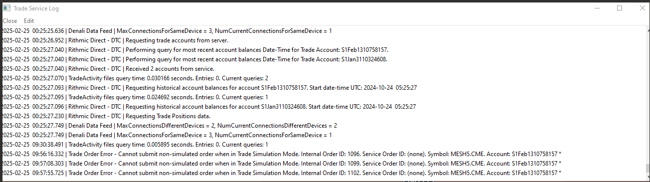 You are getting a "Permission Denied" error from Rithmic. Refer to the following: Rithmic Trading Platform Service: Permission Denied Resolution Procedure For the most reliable, advanced, and zero cost futures order routing, use the Teton service:  Sierra Chart Teton Futures Order Routing  |
