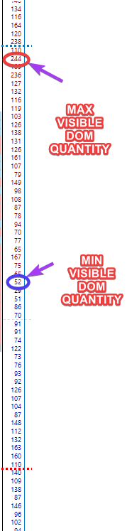 I'm adding to this thread as it is relevant and already has some good posts. Re the dynamic filter mentioned in post #15, one thing I would suggest would be the option to have the study automatically set the inputs for Minimum (Input 8) and Maximum (Input 12)based on the current minimum and maximum DOM bid/ask quantities for the price levels visible on the chart - see attached screenshot to see exactly what I mean by these minimum and maximum visible DOM values. This would enable the graph to dynamically compensate for changes in the DOM and require less manual intervention to change those two inputs during the course of a session to get a more meaningful graph. Perhaps the setting could be 10% above max visible DOM level and 10% below min visible DOM level to give some leeway to this. Thanks for considering this  |