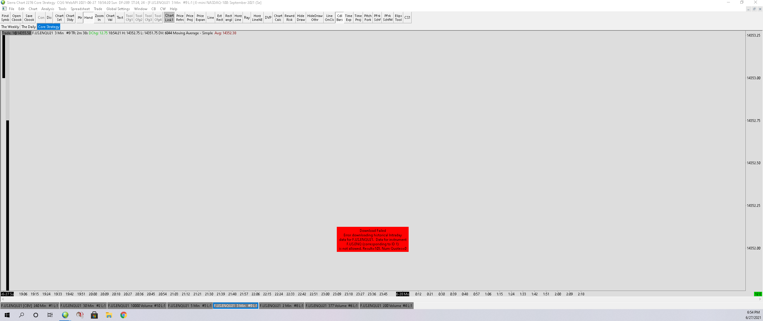 Hi guys, Currently I'm working with trading evaluator SpeedUp https://www.speeduptrader.com, I started on Monday 6/21 and was able to trade normally until Thursday 6/24. On Friday 6/25, out of nowhere, I got message "Error downloading historical intraday data. Data for instrument not allowed", screenshot attached. I'm well aware of this thread which explains I need to contact the broker: CQG Symbol is unknown Real time data for instrument not allowed (corresponding to ID =1) I've been in contact with the trading evaluator (SpeedUp), CQG and AMP (CQG told me to contact AMP) and nobody seems to be able to resolve the issue. CQG and AMP ended up redirecting me to SpeedUp but SpeedUp's support is useless. I agree with CQG and AMP, the issue must be resolved by SpeedUp. As per CQG: "After looking at your account, while you are enabled to view the data, you are not enabled for the Historical Market data feature, which explains why you cannot access that historical market data." AMP said they have no control over the SpeedUp demo. SpeedUp says everything seems alright on their end, which is BS. I'm contacting you to see if there's anything you recommend? Maybe the issue is on my end and I'm missing to enable/disable a particular setting? Under Current Selected service I have: CGQ WebAPI. I I don't even know if this is correct as SpeedUp doesn't provide a connection guide for Sierra Chart, I connected everything myself when I started and it worked until Friday 6/25. Thank you  |