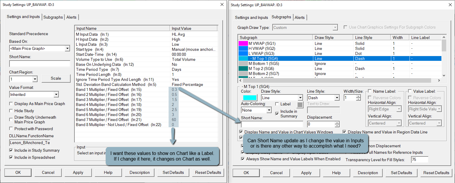 In another Indicator I am trying to show some Input Values of "Settings and Inputs tab" on the chart like a Short Name Label. I was thinking if it is possible for Short Name in Subgraph get the value of the input in Settings and Inputs through ACSIL. Is there a way to make it with ACSIL in my code? Is there another way around? What should I look for?  |