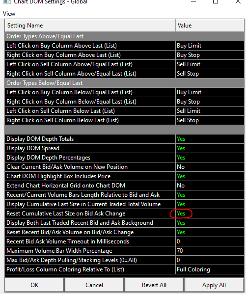 Hello, The DOM last size traded isn't accurate. It displays 1 or 2 instead of 50, 200 or 300 which was the last size traded (photo attached). I read on another thread that I had to change ''reset cumulative last size on bid and ask change'' from a no to a yes. I did that, it did not make any difference. I'm still only seeing single digits. The reason I need to see an accurate last size traded is to figure out how much trade is going through the market depth and to determine direction. It's a critical component of the DOM. I've attached two photos Thank-you! Bhupinder  |