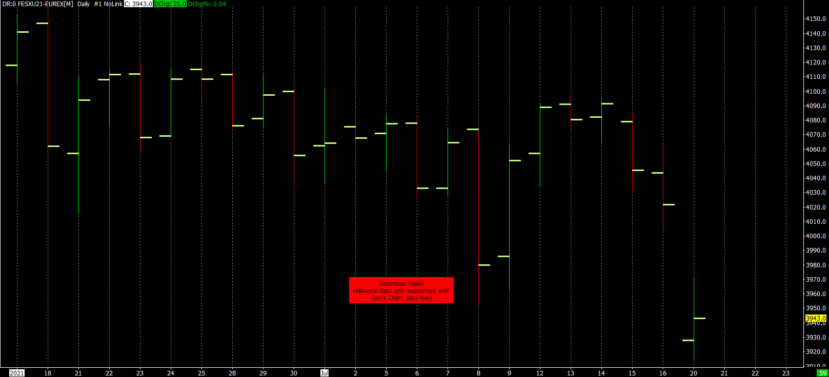 rel 2283 and rel 2288 SC Data - All services delayed There is a strange error loading daily data from eurex on fdax fesx and other, look at the image Yesterday daily data is not present, delete and download don't work. Intraday data are ok. Can you check? TY EDIT this is the message from message log when i perform the right click "delete and downlaod data" No historical data client is currently set to download historical Daily data for FESXU21-EUREX. | 2021-07-20 15:31:29.363 Date Time Of Last Edit: 2021-07-20 13:32:54