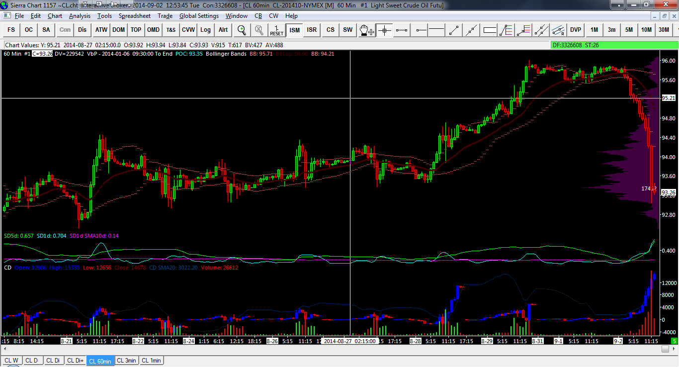 Today it happened again. Instrument: CL Data feed: yours (Sierra Exchange) Time frame: all Study: Cumulative Delta Volume Bars (rresetting start of day: yes) Intraday Data storage unit: 1 tick Attaching screenshot + chartbook of a 1min CL chart with only the CD study (1 pre reloading/recalculating chart, 1 post reloading/recalculating chart). Note both chartbooks will look the same. The screenshots do not. Would you know what is going on? I can't reload charts every time I need to make a trading decision. Takes too long. Thank you. |