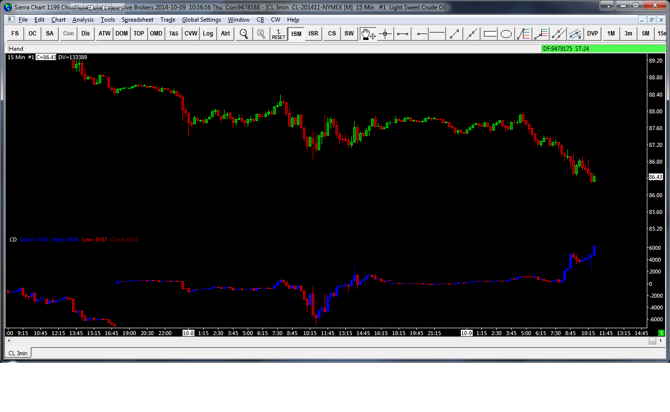 Instead of checking ES you checked CLX4 for the last three days. It does not matter. There is a reason why we checked the CL because we had a chart of CL open receiving real-time data from the Sierra Chart Exchange Data Feed in one of our copies of Sierra Chart. We did not have any real-time ES data. In any case we know it is not the data feed problem. We know how the data feed works. It is pointless for us to look into something when we are certain that is not the source of the problem.If you are using the Cumulative Delta Bars - Up/Down Tick Volume study, then we recently have become aware of a problem with that with real-time updating. But we assume you are using Cumulative Delta Bars-Volume. I would have expected you to expand on that, to see how could something like that happen, for me to avoid it from happening, rather than telling me to take a hike while using 50% of your initial response in attacking me for attaching five charts. There are various reasons this could happen but in general if you do not see [M] after the symbol even for a short time, then the data is not from the Sierra Chart data feed.Users posting charts which are not helpful and only confuse things more is very common. In general we need to see a chart that contains no other studies, has the original name of the study and the standard chart header. Otherwise, they end up getting disregarded which is common. Probably 60% of the charts posted here provide no useful information to us. We do explain this here: https://www.sierrachart.com/index.php?page=PostingInformation.php#Image Sierra Chart Support - Engineering Level Your definitive source for support. Other responses are from users. Try to keep your questions brief and to the point. Be aware of support policy: https://www.sierrachart.com/index.php?l=PostingInformation.php#GeneralInformation For the most reliable, advanced, and zero cost futures order routing, *change* to the Teton service: Sierra Chart Teton Futures Order Routing Date Time Of Last Edit: 2014-10-02 19:02:52