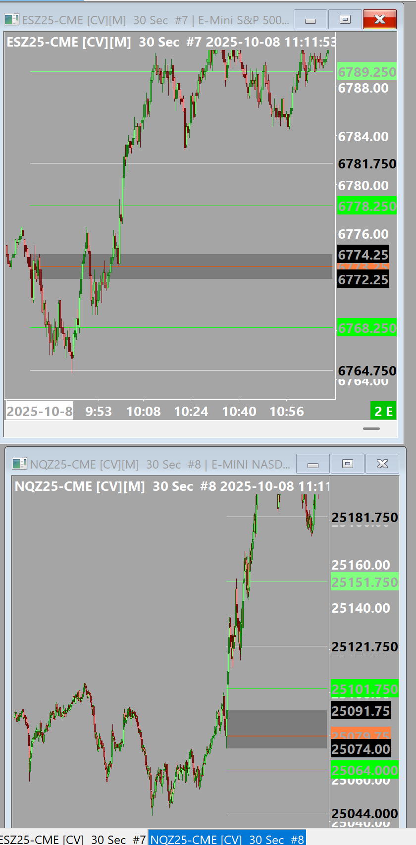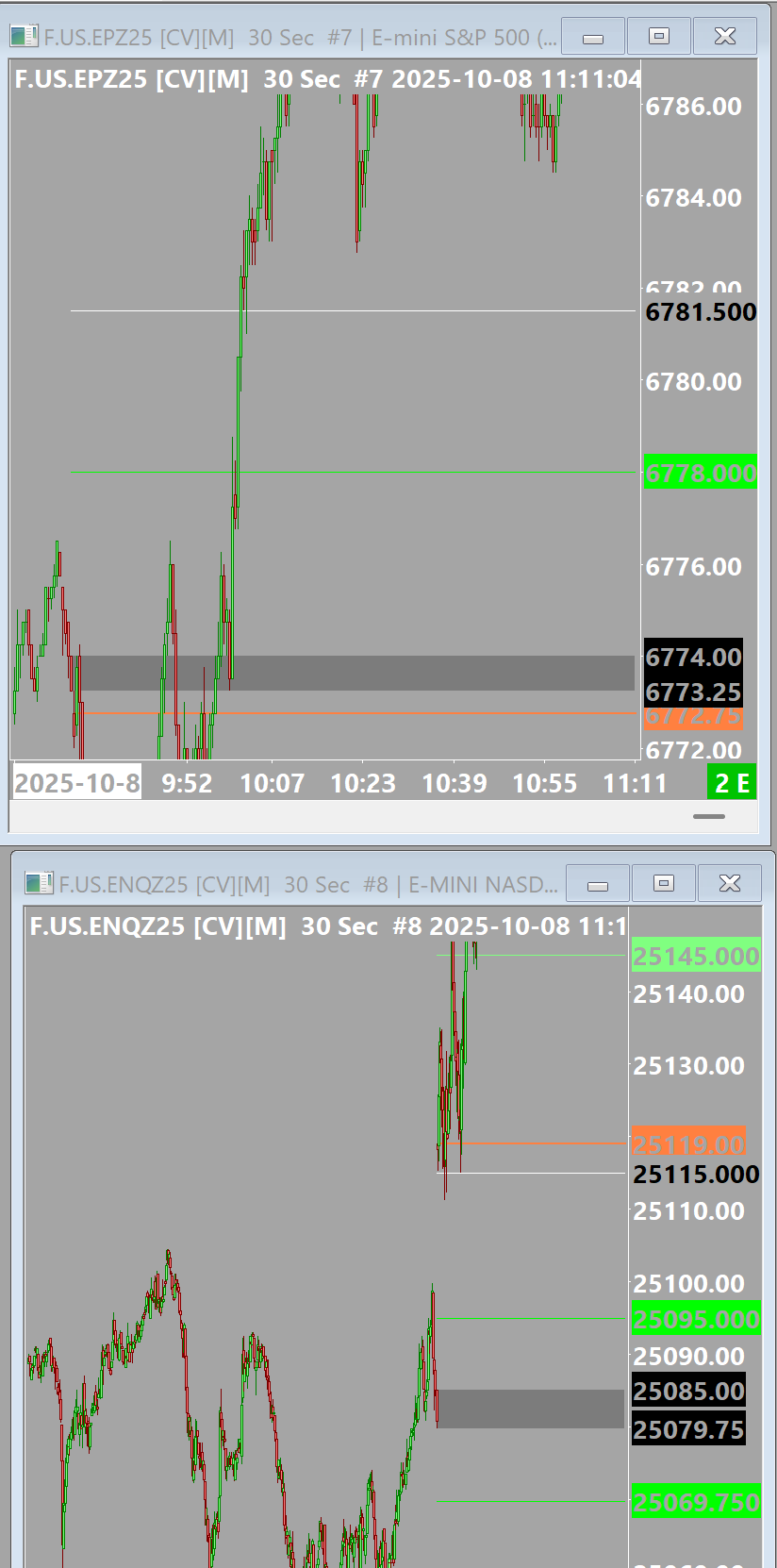 I have closed my system down, last message in my log is at 13:27:23, so I will not show anything for the 9:30 open. What you will see in the pictures attached in previous message is as follows. I have a high/low for time period extended. It populates the high/low for the first 30 seconds and the opening print. The H/L are in black, and the opening print in orange. The correct data is as follows: ES: 6774.25 High, 6772.25 Low, 6773.25 opening print. NQ: 25091.75 high, 25074 low, 25079.75 opening print, this populated on the SC data correctly. On the CQG webapi it populated as follows off the open: ES: 6774 high, 6773.25 low, 6772.75 opening print. NQ: 25085 high, 25079.75 low, 25119.00 opening print. System froze on the open, then had to disconnect and reconnect for feed to come back, but did not have any of the right data. I have fixed it by deleting and redownloading that data now, but I was wondering why it happened and how to avoid this issue in the future?