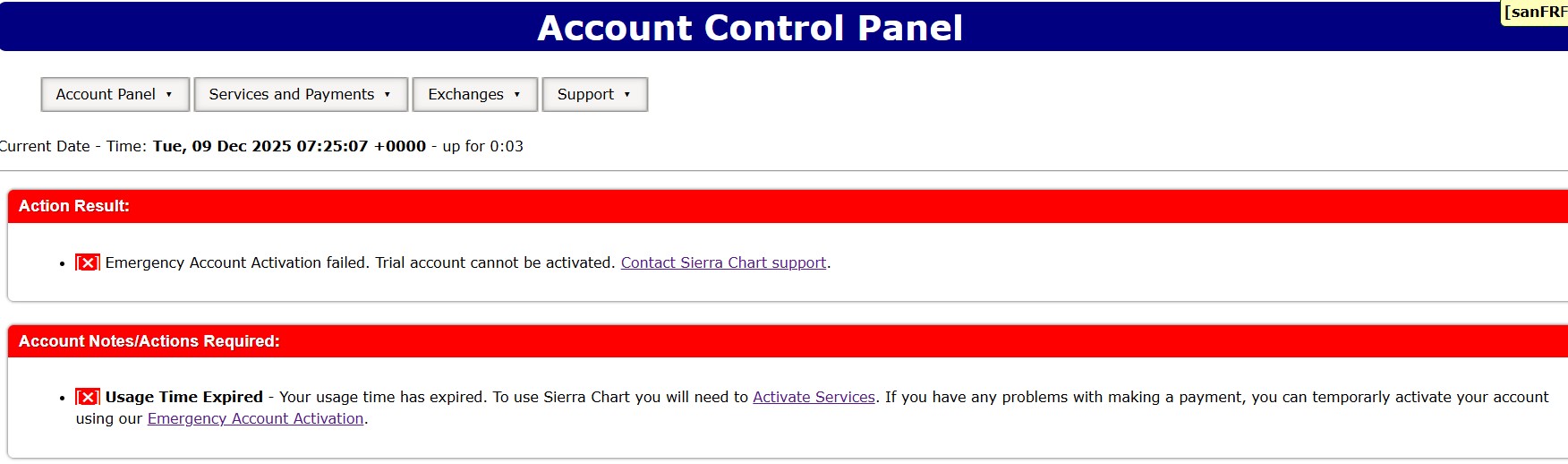 We have reactivated the trial on your account. What Service Package do you need? For Sierra Chart pricing, refer to this page: Description of Service Packages and Pricing Sierra Chart Support - Engineering Level Your definitive source for support. Other responses are from users. Try to keep your questions brief and to the point. Be aware of support policy: https://www.sierrachart.com/index.php?l=PostingInformation.php#GeneralInformation For the most reliable, advanced, and zero cost futures order routing, use the Teton service: Sierra Chart Teton Futures Order Routing Date Time Of Last Edit: 2025-12-09 13:42:40