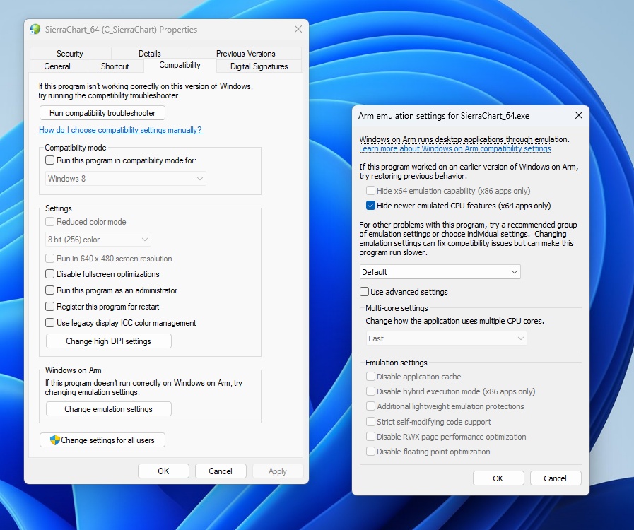 You didn't say if you tried to change the Compatibility Settings for the ARM.exe: I found the new features can be disabled. Right-click on the SierraChart_ARM64.exe file Properties>>Compatibility>>Change Emulation Settings and then check the box for Hide Newer Emulated CPU Features (x64 apps only)