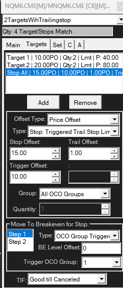 You do not need the "Move to Breakeven settings for the Stop, as the Triggered Trail Offset will move it to within 1 point of the current price once the price has gone up 10 points, which is also where the first target is located. But that does not explain what you are seeing. It should work just fine. Attached is an image of what we get when we do this setup. We did move the Stop down a bit just to make it more obvious. Something is not showing correctly. The Stop orders showing in the chart are "Triggered Step Trail Stop Limit". But your Trade Window shows it as a "Triggered Trail Stop Limit" (not a Step Trail). We wonder if that is the correct Trade Window for that chart. For the most reliable, advanced, and zero cost futures order routing, use the Teton service: Sierra Chart Teton Futures Order Routing |