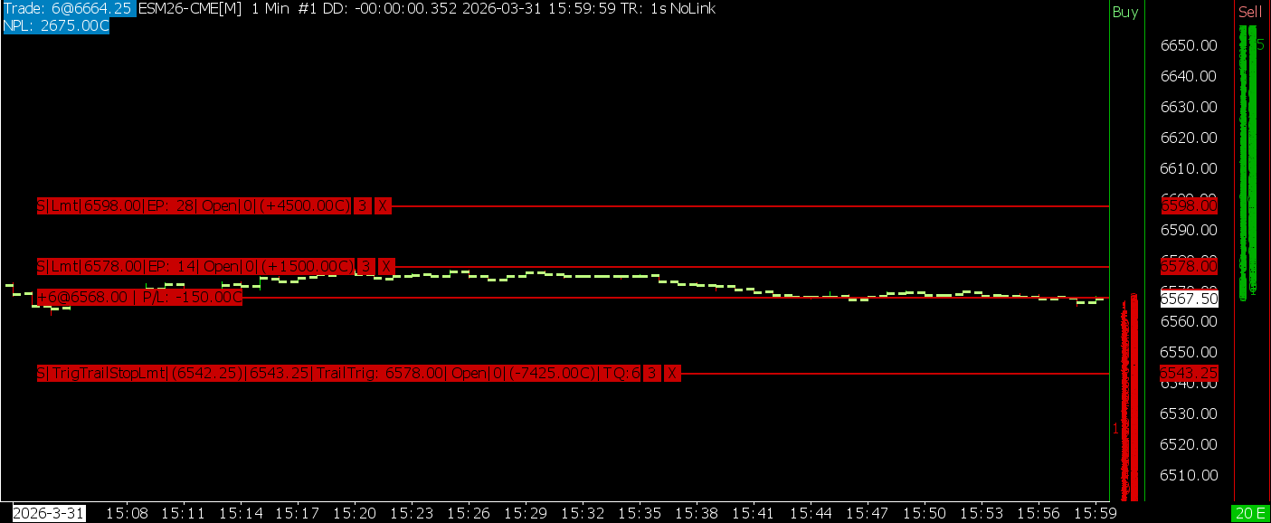 I've gone through your documentation and I'm still having trouble having success with 2 types of oco orders. #1. for example 6 contracts. 2 targets. target 1 10pts, target 2 30pts. Stop loss is same for all contracts. Target 1 is reached and 3 are sold and 3 contracts remain and go to B/E. then trail 1pt after target 1 reached and target 2 remains. #2. same 6 contracts stop loss for all contracts Target 1 10 pts 3 contracts off. target 2 20pts and 2 contracts off. remaining 1 contract trails 1 point after target 1 and trails 5pt after target 2 hits. last remain contract is manual exit. Lastly, sometimes when I have simple OCO bracket with two targets, sometimes there remains open OCO order after I'm flat. I'm unable to figure why this is happening? |