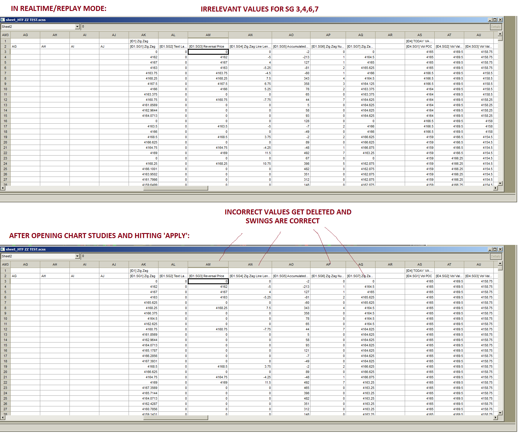 @40winks thank you for trying to help, it is much appreciated Number of Bars Required for Reversal: is only relevant for ZZ mode 2 (i am using mode 1) were you able to understand from the screenshot that the issue is related to ZZ printing unconfirmed values? see cells AM7, AM9, AN7, AN9, AN10 ....many others. these values are INCORRECT and get magically auto-eliminated once the Chart Studies page is opened and closed (refreshed) [F6]. @SC Engineering this certainly looks like a defect in the study that needs attention. what more information do you need? I am happy to assist in solving this any way i can. |