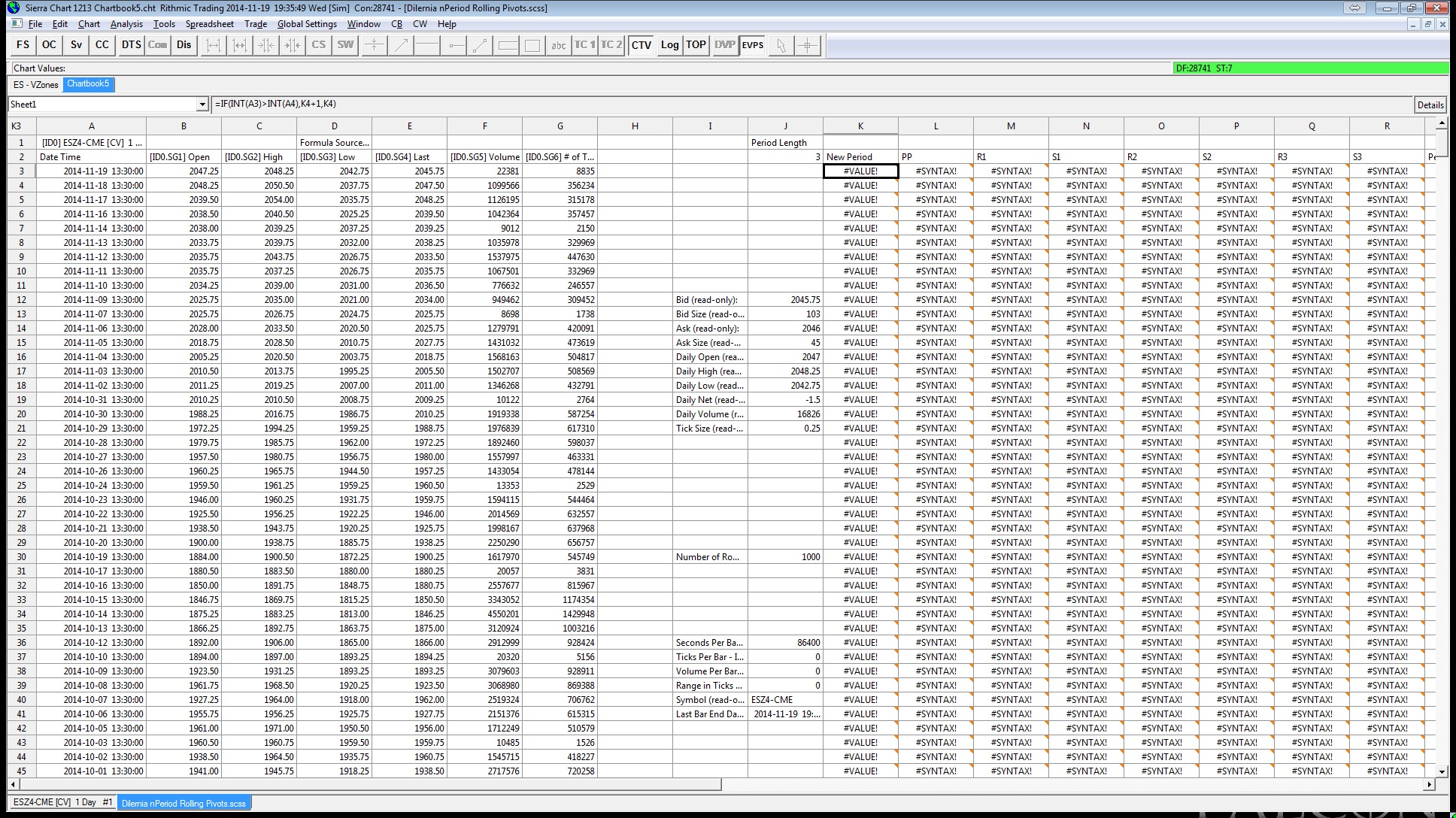 Ahh, ok. I installed the old spreadsheets version and it's running on there but I'm still having the same issue as I originally mentioned. The pivots don't shift at the session end time, they shift in the middle of the session. In the screenshot, the session end time is marked by the vertical lines. http://www.sierrachart.com/image.php?l=1416465471131.png |