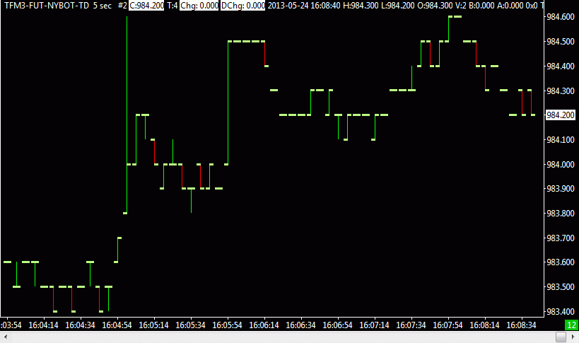 We got the information. Thank you. Here is a chart using 5 seconds data: http://www.sierrachart.com/image.php?l=1372433541339.png Timestamps are to times which are a multiple of 5. Sierra Chart Support - Engineering Level Your definitive source for support. Other responses are from users. Try to keep your questions brief and to the point. Be aware of support policy: https://www.sierrachart.com/index.php?l=PostingInformation.php#GeneralInformation For the most reliable, advanced, and zero cost futures order routing, *change* to the Teton service: Sierra Chart Teton Futures Order Routing |