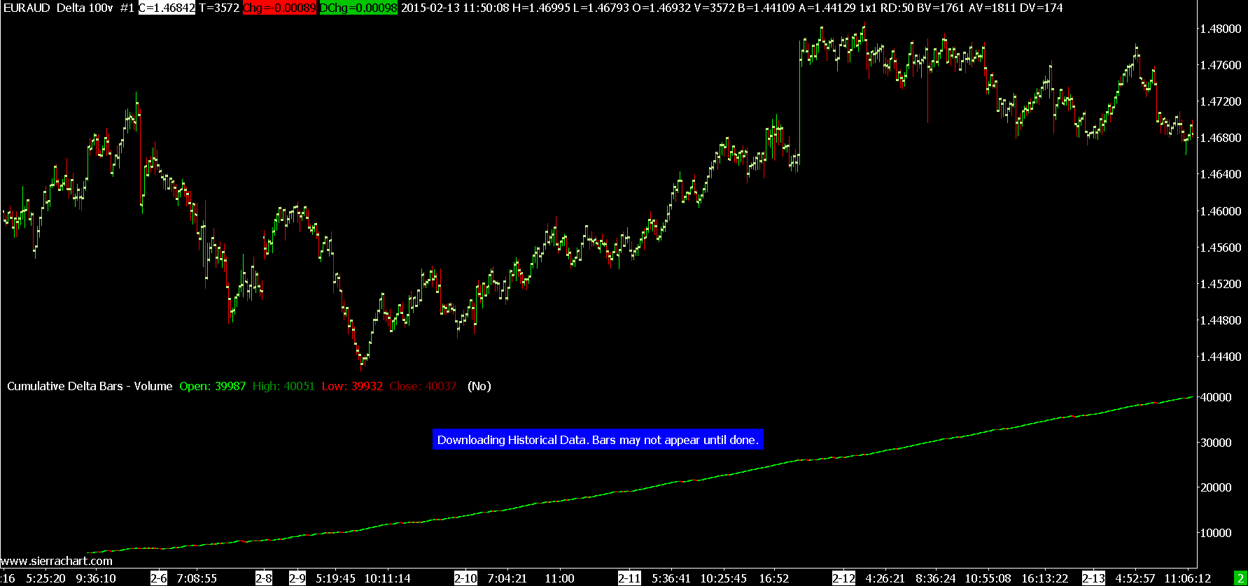 Hello, would you please help me get my charts set up correctly to use the Cumulative Delta - Volume on the SC Forex (FXCM) forex pair symbols, on Delta Volume Per Bar charts? I've scoured the forum, made sure my Intraday Data Storage Time Unit is set to "1 Tick", erased and reloaded data, etc. but I'm still getting cumulative delta - volume indicators that just rise and rise and rise and what is printing doesn't stand to reason / isn't useful. Thanks! Date Time Of Last Edit: 2015-03-02 00:26:25