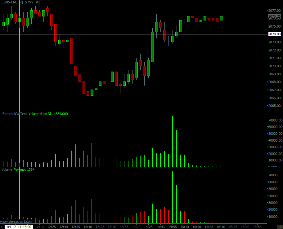 zaza - Here is a sample code you can use for this. typedef int (__cdecl *SETINT)(int); typedef int (__cdecl *GETINT)(void); HINSTANCE hinstLib = LoadLibrary(TEXT("F:\\temp\\M_GV_d.dll")); SETINT SetInt = (SETINT) GetProcAddress(hinstLib, "GV_SetInteger"); GETINT GetInt = (GETINT) GetProcAddress(hinstLib, "GV_GetInteger"); SCSFExport scsf_ExternalCallTest(SCStudyInterfaceRef sc) { SCSubgraphRef Volume = sc.Subgraph[0]; if (sc.SetDefaults) { sc.GraphName = "ExternalCallTest"; sc.StudyDescription = "ExternalCallTest."; sc.AutoLoop = 1; Volume.Name = "Volume from Dll"; Volume.DrawStyle = DRAWSTYLE_BAR; Volume.LineWidth = 2; Volume.PrimaryColor = RGB(0, 255, 0); sc.FreeDLL = FREEDLL; return; } if (sc.LastCallToFunction) { FreeLibrary(hinstLib); return; } SetInt((int)sc.Volume[sc.Index]); Volume[sc.Index] = GetInt(); return; } http://www.sierrachart.com/image.php?l=1429469107752.png Date Time Of Last Edit: 2015-04-19 19:16:47