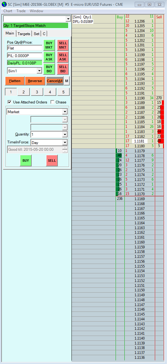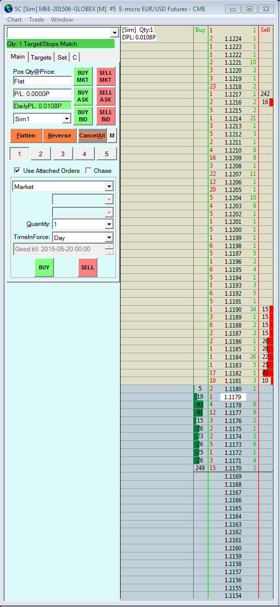 Ok, thank you. By the way I am using the Sierra Chart CME data feed. The problem occurs only with EUR/USD (micro futures) and GBP/USD (micro futures). I have a AUD/USD (micro futures) open as well and not having any problem. Even the micro fx futures chart is affected from this strange behavior, not only the DOM. At the moment for example I am unable to trade EUR/USD (micro futures contract). Date Time Of Last Edit: 2015-05-19 06:48:07
