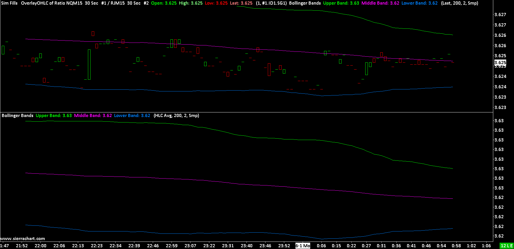 All I'm basically doing is adding a bollinger band to a "high accuracy" spread as per the instructions offered on the Sierra Chart website. In my particular case the input to the OverlayOHLC study is a Spread - Butterfly study but it'll act exactly the same using Diff (single line). It's basically the OverlayOHLC study with bollinger bands. I'm also having another issue seemingly related to this where I have an alarm on a horizontal line within the region that has an OverlayOHLC study and it keeps getting triggered every single new bar with values of 0.00000 crossing the line (which is obviously not the case). It triggers the alarm like clockwork, every new bar. I feel these two issues are connected. This most definitely resembles a bug. I'll upload both chartbooks in a bit. Date Time Of Last Edit: 2015-05-20 05:20:14
