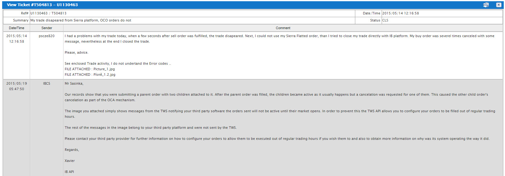 IB wrote, that "Our records show that you were submitting a parent order with two children attached to it. Aftre the parrent order was filled, the children became active as it usually happens but a cancelation was requested for one of them. This caused the other child order“s cancelation as part of theOCA mechanism". This is the truth. The point is that I cancelled the child because my parent order disapeared on Sierra platform (I was extremely nervous, on Sierra I saw two children orders and the trade disapeared. SO, I planned to decrease the problem.) Please, advice .. |