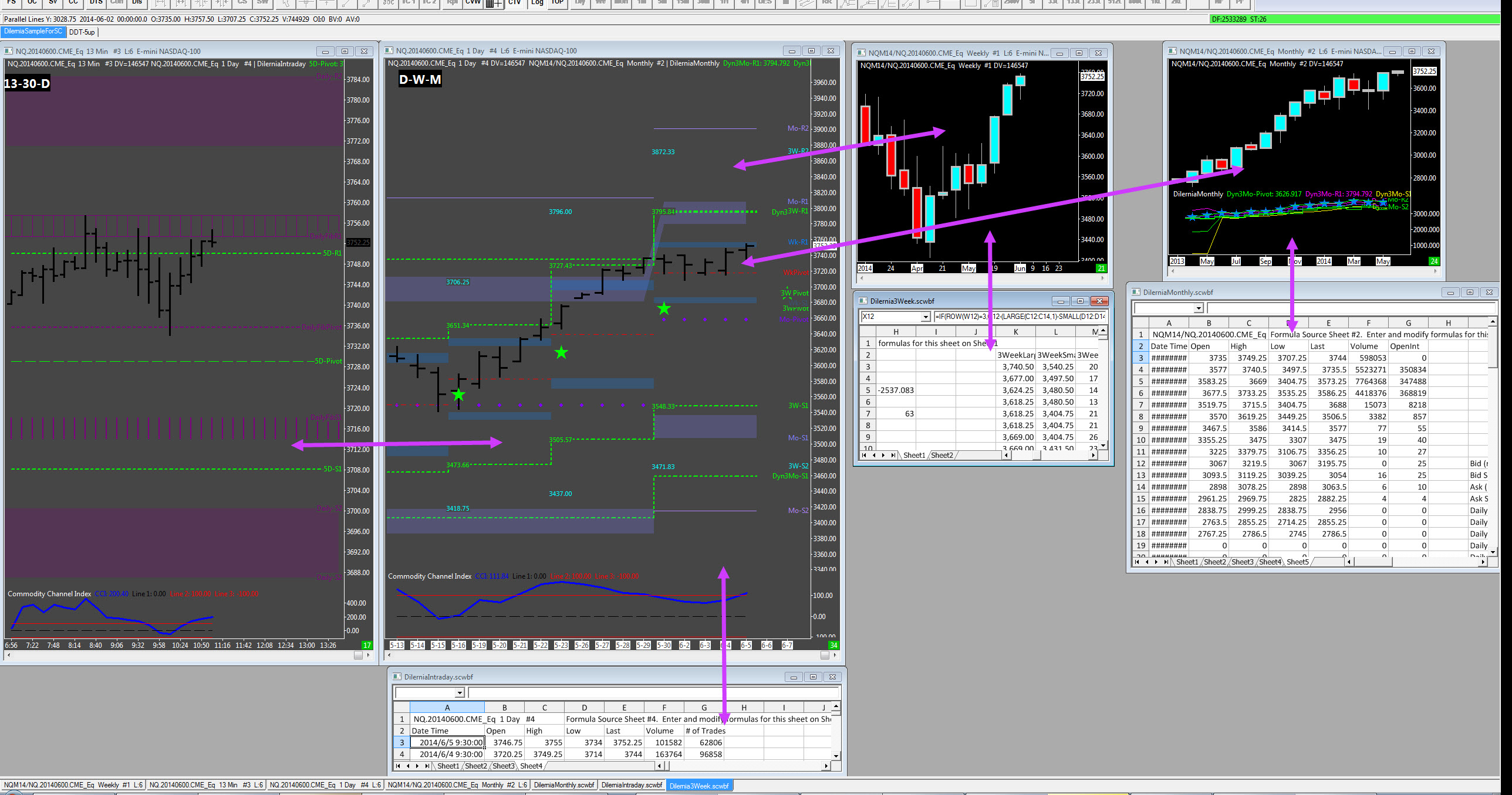 I have a Quote Spreadsheet set up with streaming data for Last, Net change and volume on a range of commodities into which data from the sheets of another spreadsheet is fed to give further columns showing: cumulative volumes vs prev day on 15min chart total volume previous day vs 2 days back trend on 15 min chart trend on daily chart Inside day proximity to high, mean or low of current day Market open or closed in relation to time bands identified by myself. This Quote Spreadsheet is used as a very effective scanner to determine the best candidates for day trading. I would have no problem integrating this into one spreadsheet provided at least the first page of that could be used in a similar manner to the current Quote Spreadsheet. Please consider this situation. Date Time Of Last Edit: 2013-06-12 19:09:25
