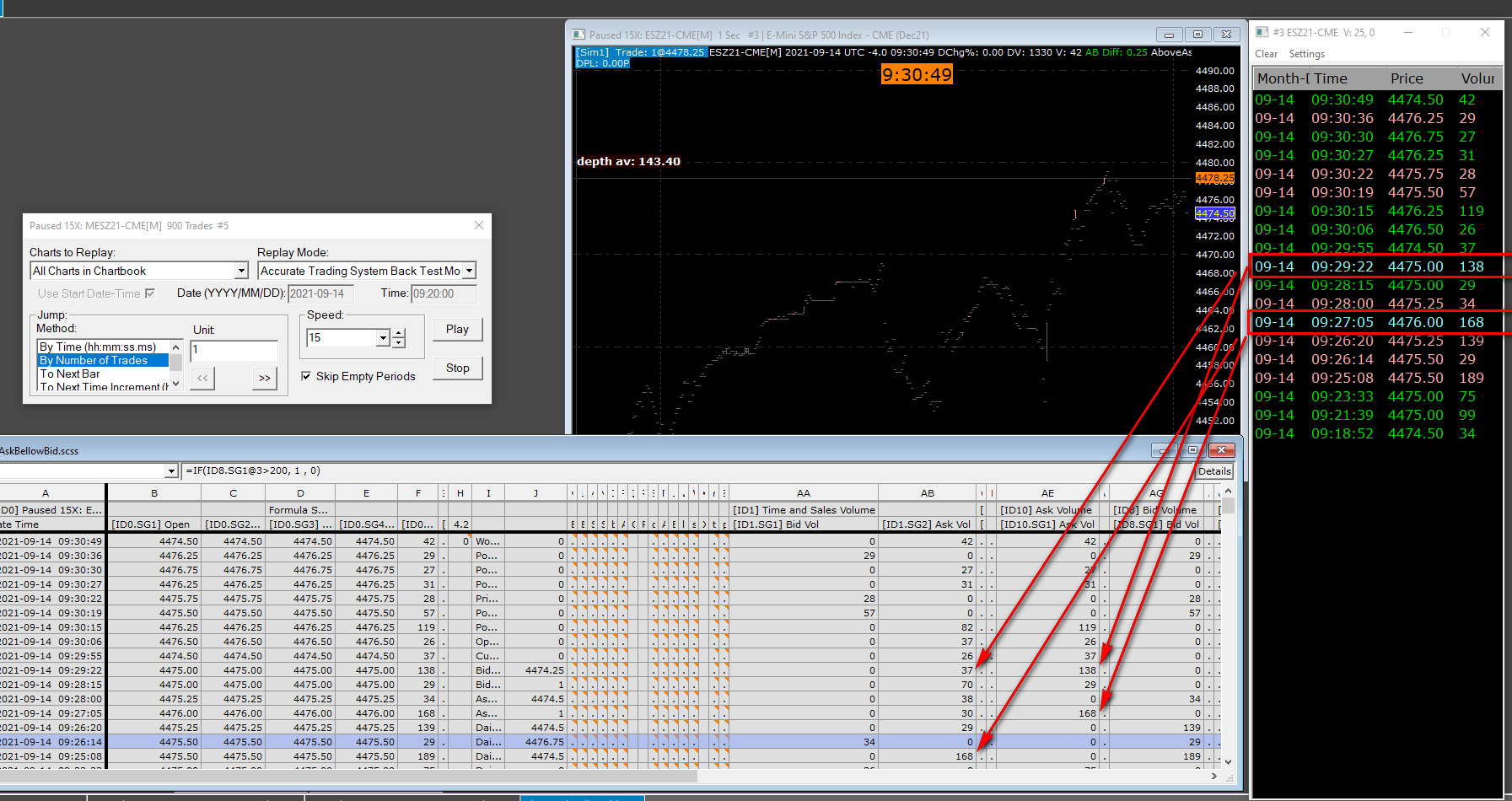 I am using Spreadsheets for automated trading. Please tell me if there is a Study platform, which would be able to output from the filtered by volume of Time and Sales, signals of appearance of Bellow Bid Trades and Above Ask Trades? I want to see these signals in Spreadsheets |