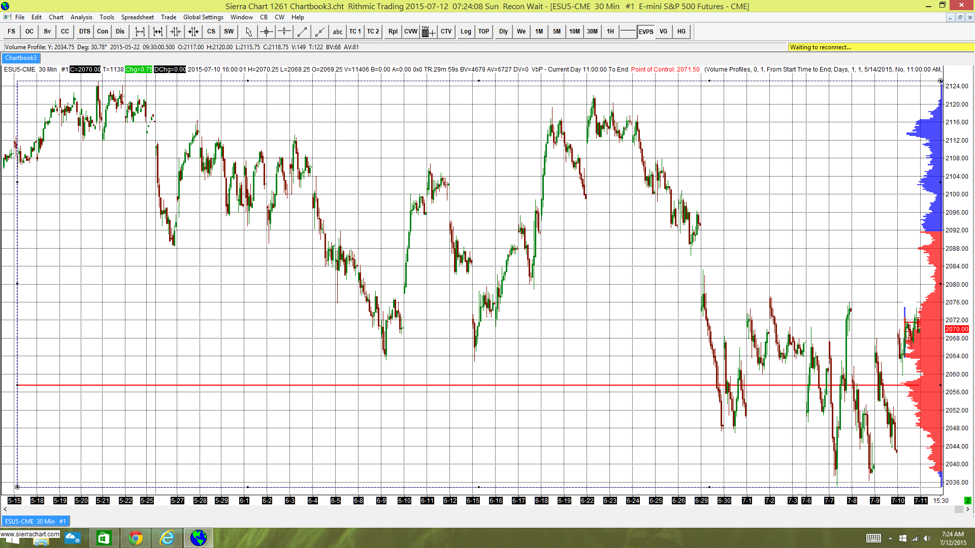 Thank you for posting on the support board. What is the "Extend Peaks and Valleys" input set to? It cannot be until Future Intersection. That will not work for the particular Volume Graph Period Type you are using. Sierra Chart Support - Engineering Level Your definitive source for support. Other responses are from users. Try to keep your questions brief and to the point. Be aware of support policy: https://www.sierrachart.com/index.php?l=PostingInformation.php#GeneralInformation For the most reliable, advanced, and zero cost futures order routing, *change* to the Teton service: Sierra Chart Teton Futures Order Routing |