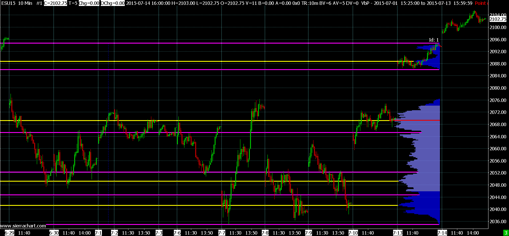 I couldn't draw the peaks and valleys in the volume profile. I have selected draw peak and valley, selected horizontal line for peaks and valleys, sensitivity is 10 and selected yes for include high low in peak and valley. What am I doing wrong. Please help.... http://www.sierrachart.com/image.php?l=1436700253484.png Thaks Joseph |