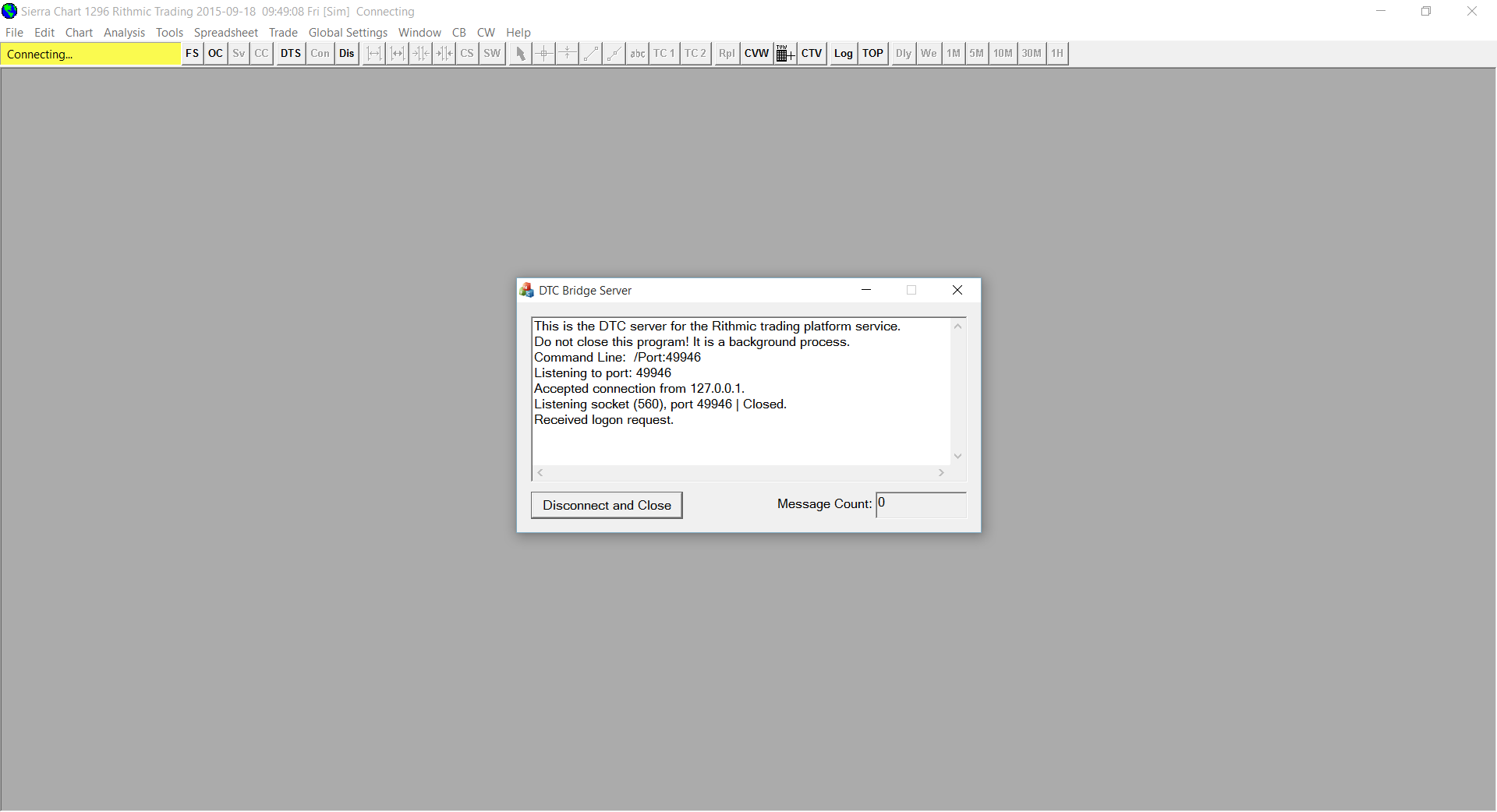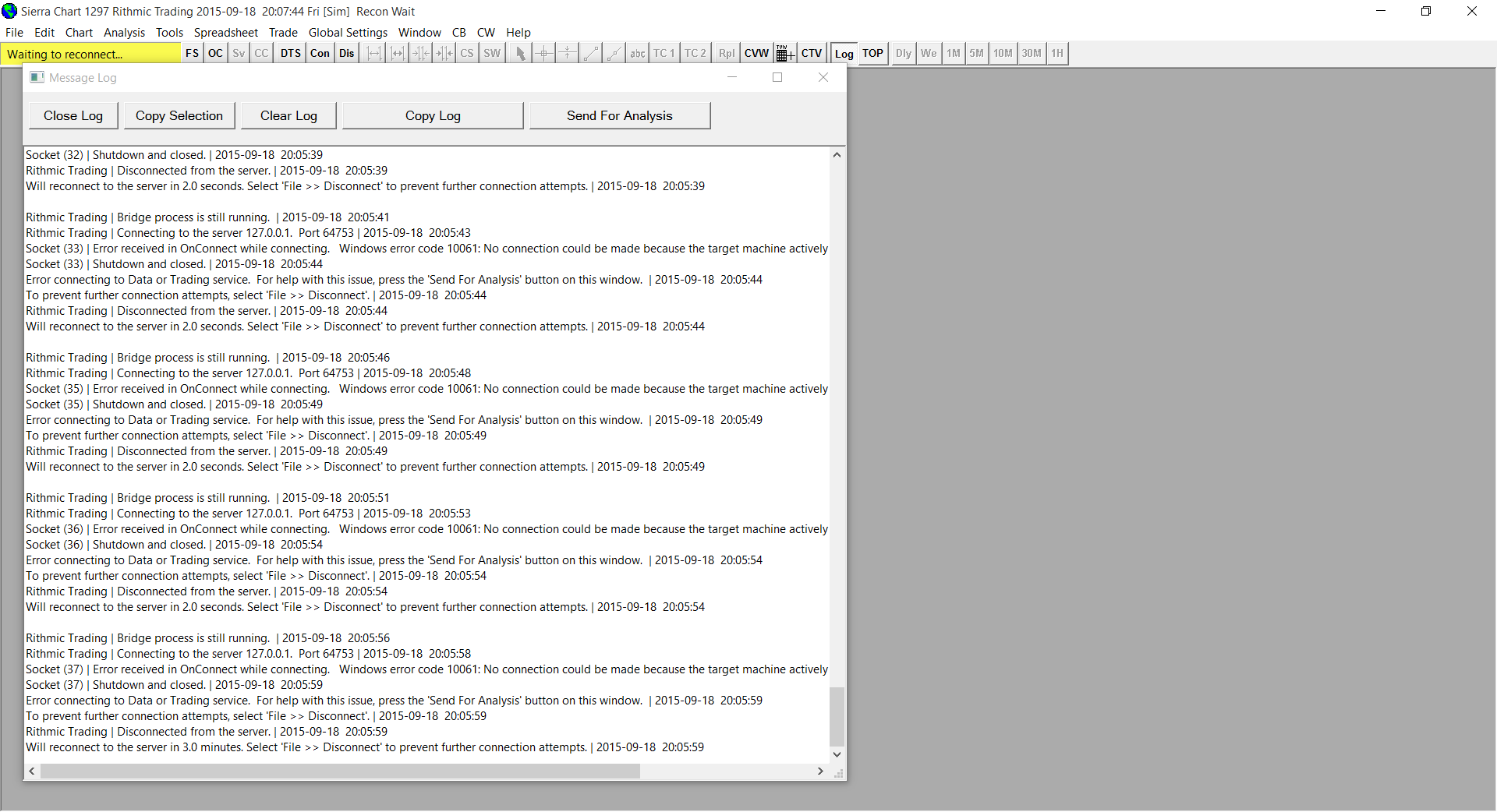 We see you are having trouble connecting to Rithmic which is a very common problem. Most likely you are getting a "permission denied" error. Refer to step 17 here: Rithmic Trading Platform Service: Setup Instructions Sierra Chart Support - Engineering Level Your definitive source for support. Other responses are from users. Try to keep your questions brief and to the point. Be aware of support policy: https://www.sierrachart.com/index.php?l=PostingInformation.php#GeneralInformation For the most reliable, advanced, and zero cost futures order routing, *change* to the Teton service: Sierra Chart Teton Futures Order Routing |