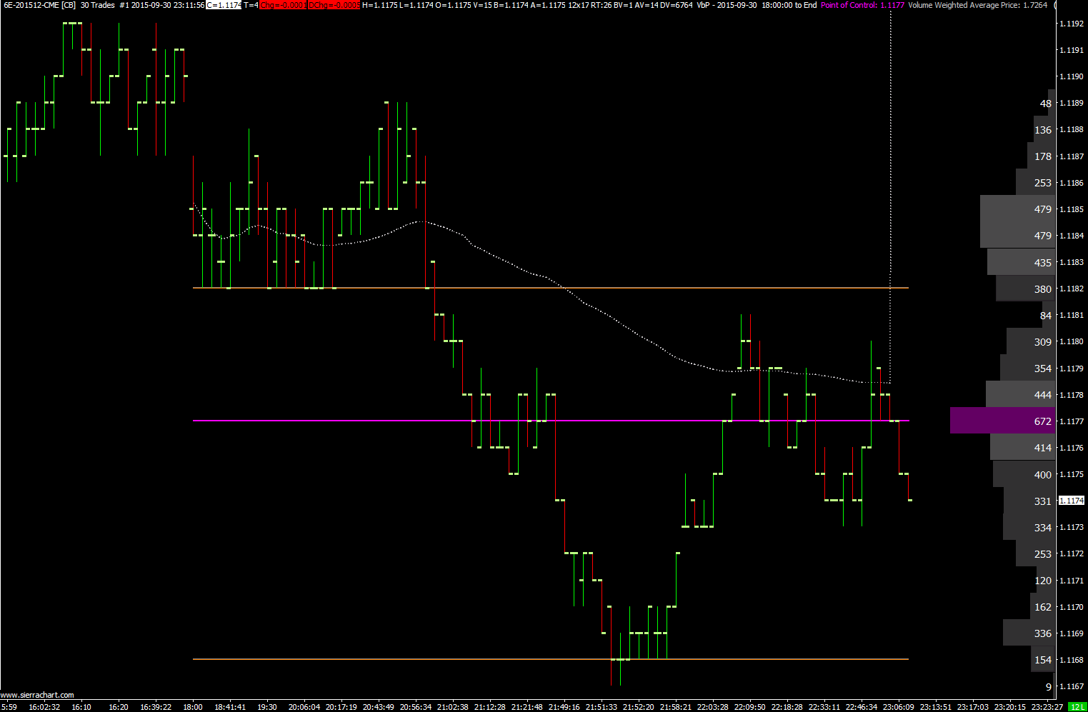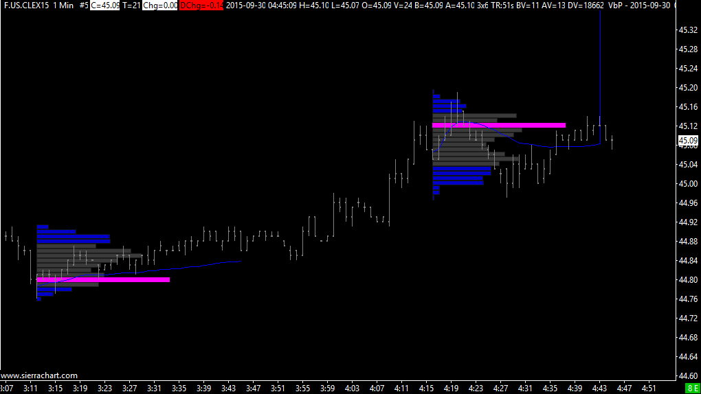 I like it not being a straight line across the chart. In other words, I like the VWAP displaying each bars value. (That's partly because I already have a custom study that draws the straight line for the latest VWAP value.) The image link is a chart with the Volume By Price study added. The VWAP line is going straight up on the current bar. http://www.sierrachart.com/image.php?l=1443669153219.png Actually, it's not the current bar. Looks like after the VWAP goes straight up, the VWAP stops updating. Date Time Of Last Edit: 2015-10-01 03:21:23