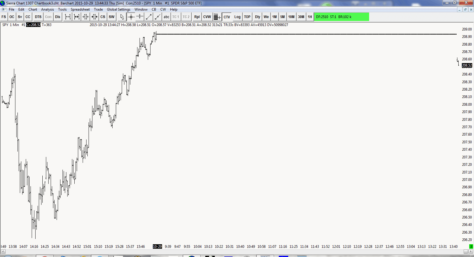 Letting you know the problem has been confirmed. There is no 1 tick data from 2015-10-28 13:00 US Eastern time on the Barchart system. They have been advised of the issue. Sierra Chart Support - Engineering Level Your definitive source for support. Other responses are from users. Try to keep your questions brief and to the point. Be aware of support policy: https://www.sierrachart.com/index.php?l=PostingInformation.php#GeneralInformation For the most reliable, advanced, and zero cost futures order routing, *change* to the Teton service: Sierra Chart Teton Futures Order Routing |