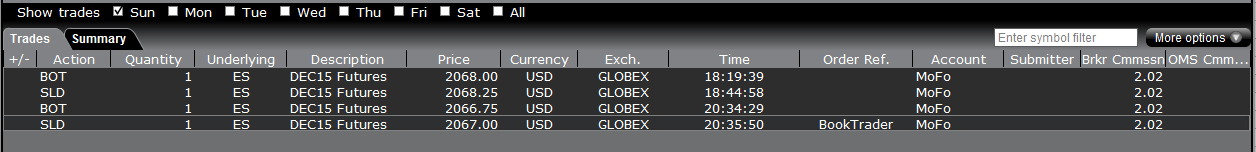 ActivityType DateTime Symbol OrderActionSource InternalOrderID ServiceOrderID OrderType Quantity BuySell Price Price2 OrderStatus FillPrice FilledQuantity TradeAccount OpenClose ParentInternalOrderID PositionQuantity FillExecutionServiceID Order 2015-11-01 17:59:16.000 Requesting all orders from trading service Unspecified None Order 2015-11-01 18:05:52.000 Trade Simulation Mode has been disabled Unspecified None Order 2015-11-01 18:17:33.000 Requesting all orders from trading service Unspecified None Order 2015-11-01 18:18:17.000 Requesting all orders from trading service Unspecified None Order 2015-11-01 18:44:17.000 Requesting all orders from trading service Unspecified None Order 2015-11-01 18:51:55.000 Requesting all orders from trading service Unspecified None Order 2015-11-01 19:10:32.000 Trade Simulation Mode has been enabled Unspecified None It's done this before and that's why I was checking it during low volume overnite hours tonight. this is the TWS trade log BOT 1 ES DEC15 Futures 2068.00 USD GLOBEX 18:19:39 MoFo null 2.02 SLD 1 ES DEC15 Futures 2068.25 USD GLOBEX 18:44:58 MoFo null 2.02 the SLD at 18:44:58 is the sale/close after it did not respond to the Flatten command except for killing the open orders for target price and stop. The BOT was executed from the order sent by SC, Flatten is as previously described, it kills the orders but doesn't close the postitions, must go into TWS to do that. I've seen this before. This particular test was a Buy at market, Target of 8 ticks, Stop of 4 Ticks; I just wanted to verify the oddity I had previously seen on it not closing positions. |