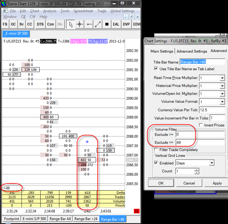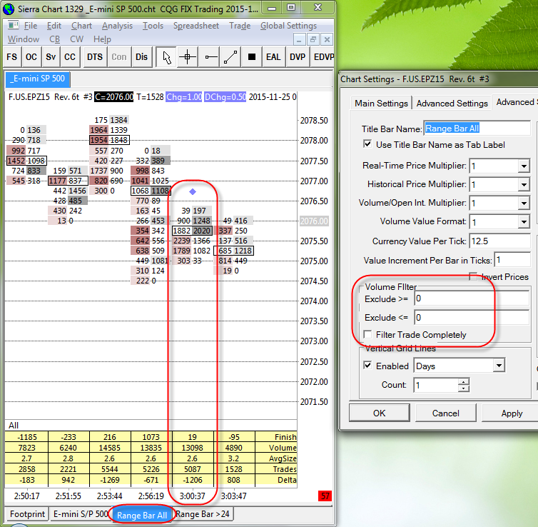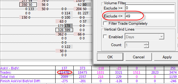 Good day support.Installed Pre Release: 1338 (December 11, 2015) Not all the calculations are correct. Lines Volume, AvgSize, Trades, Delta calculated similarly (with / without filter). Finish Line different (with / without filter). |
