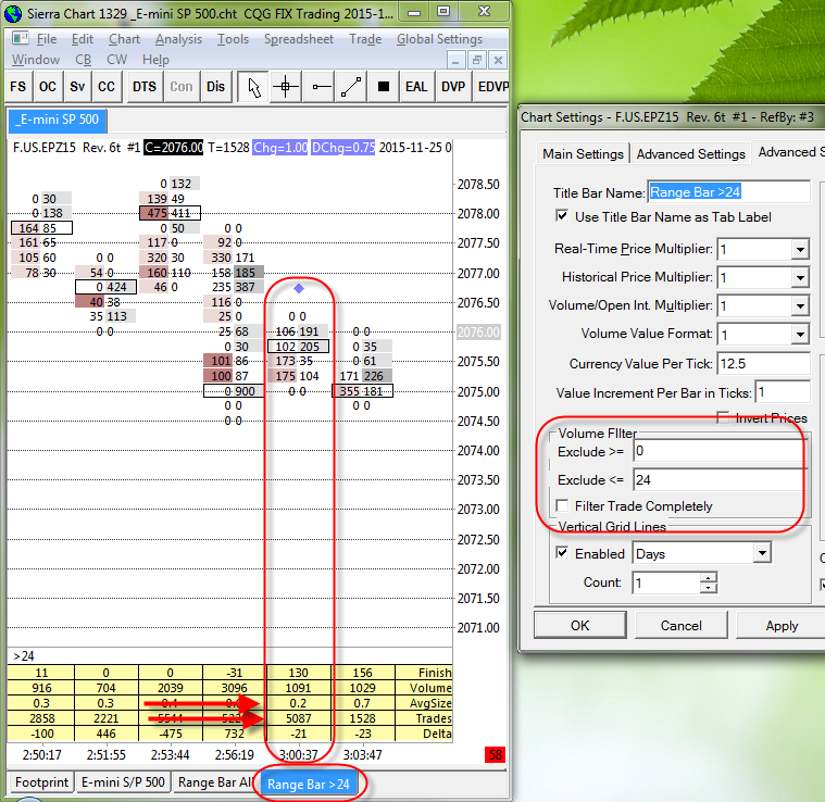1. Open the chart and renamed (Range_Bar_All). Choose period Reversal Bar (6t). I add and configure Number_Bars. I add and configure Numbers_Bars_Calculated_Values. No filter is applied. All perfectly. (screen 10) Copy and rename the chart (Range_Bar_> 24). Apply filter. (screen 11) In Numbers_Bars_Calculated_Values Trades are not filtered. AvgSize wrong. Question: How Numbers_Bars_Calculated_Values count Trades larger than 24? 2. The same two charts. Overlaying filtered Numbers Bars Calculated Values in the chart (Range_Bar_All). Values Numbers Bars Calculated Values change when transferring. (screen 12) Question: How do I transfer the filtered Numbers Bars Calculated Values to another chart unchanged. (screen 13) Thank you Date Time Of Last Edit: 2016-02-10 09:33:16