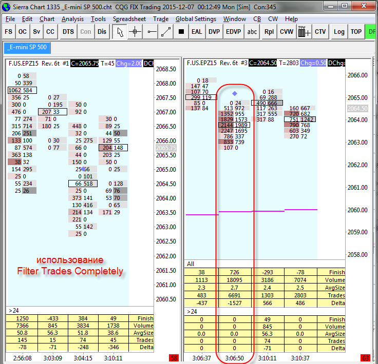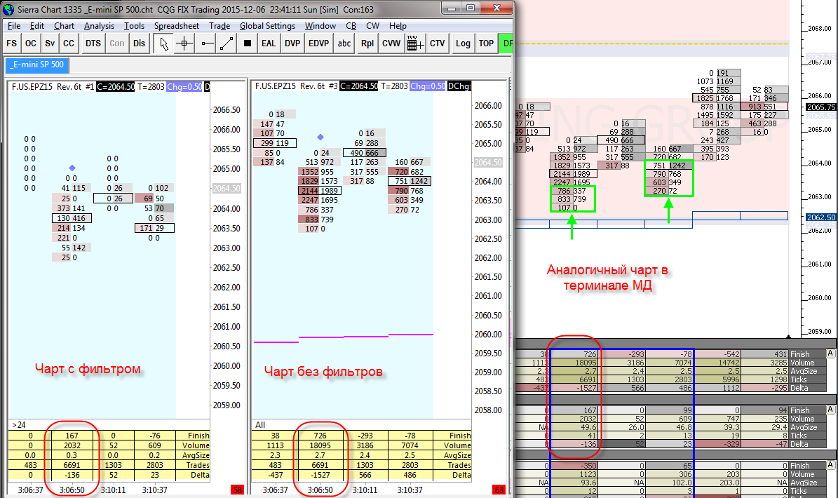 Здравствуйте поддержка. Вопросы буду задавать на русском языке. Отвечать прошу, пожалуйста, на русском языке. (для меня тяжело формулировать технические вопросы не зная языка) Я хочу настроить чарт аналогично иллюстрации 11. На иллюстрации ваш терминал в сравнении с терминалом МД. Вопрос 1. Почему при добавлении фильтра на чарт значение Trades в индикаторе Numbers Bars Calculated Values не изменяется? Если фильтр может исключать из расчета сделки с определенным в фильтре объёмом, почему индикатор неправильно рассчитывает их количество? Следовательно, неправильно рассчитывается средний объём "AvgSize". Вопрос 2. Почему при переносе индикатора Numbers Bars Calculated Values с отфильтрованного чарта на основной чарт (иллюстрация 12) значения индикатора Numbers Bars Calculated Values изменяются? Применение опции "Filter Trades Completely" (иллюстрация 13) в данном случае не приемлемо. Welcome support.