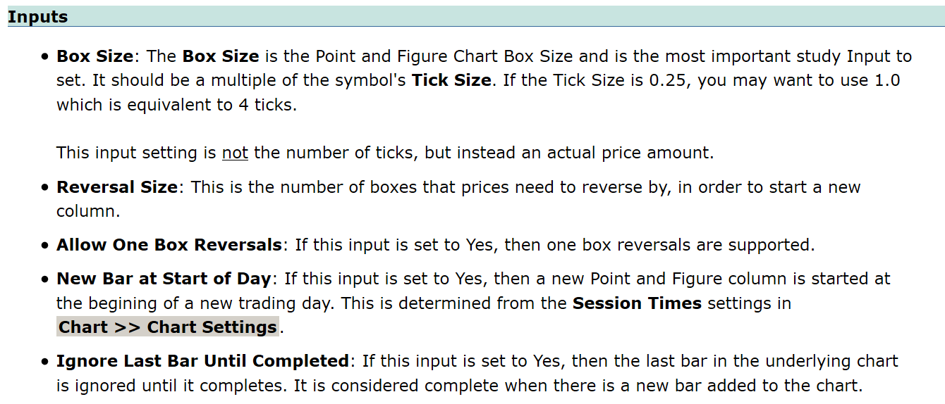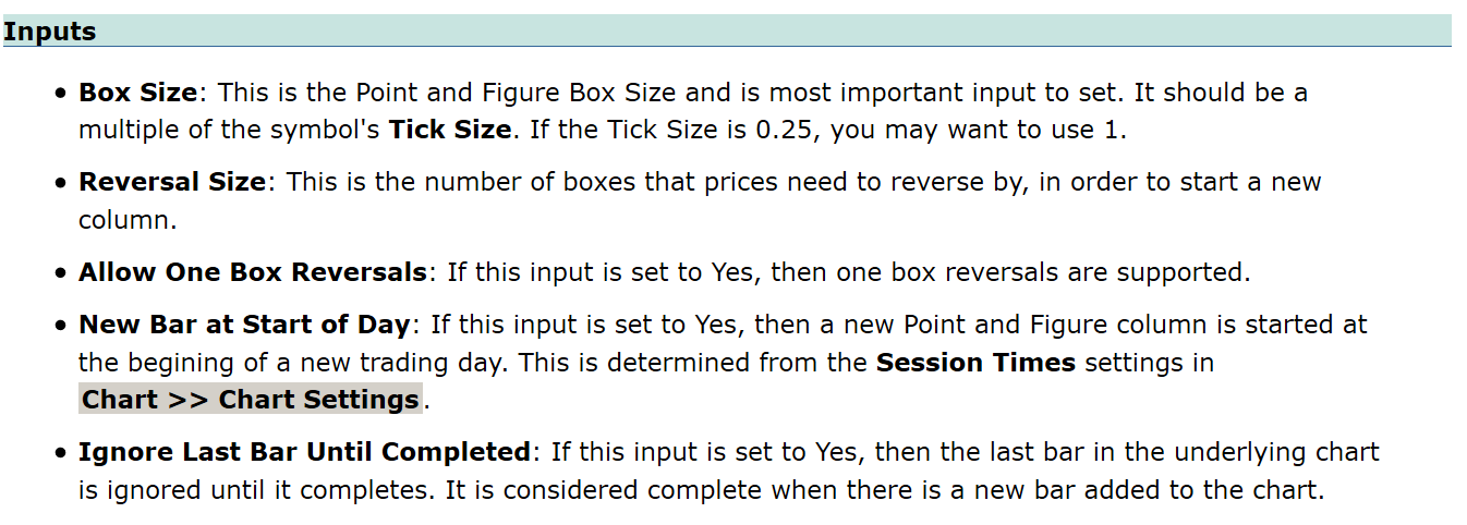 The original reference guide said: Box Size: This is the Point and Figure Box Size and is most important input to set. It should be a multiple of the symbol's Tick Size. If the Tick Size is 0.25, you may want to use 1. --- But someone of you guys modified the doc after I posted this topic. Part of it still says it's the tick size. I attached the image of before and after your doc change. -- So I consider this as a bug. In any case, it doesn't make sense to restrict to the absolute value. The current setting force me to modify point and figure chart for every contract. I cannot use universal study group. |