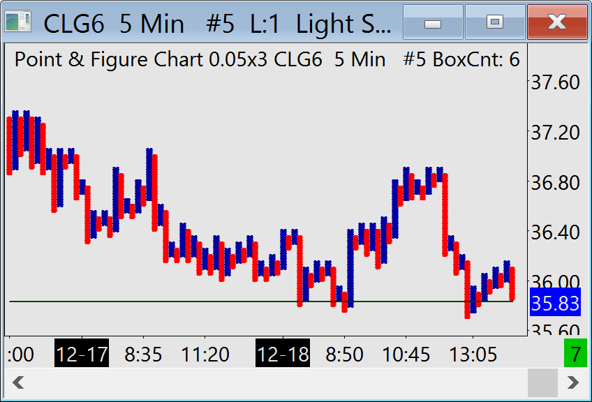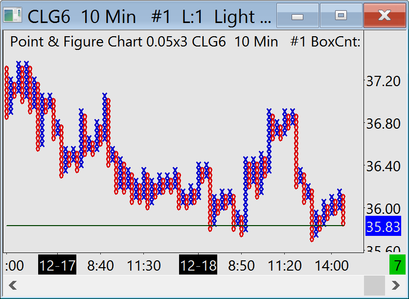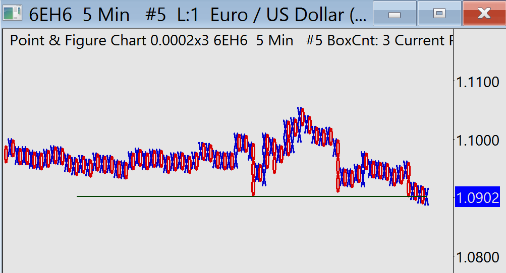 Remove the Point and Figure chart study from the chart posted in #6. Do the underlying prices look correct? We opened a chart, added the Point and Figure chart study, set it up as you have and changed the symbol of the chart to the 6E and it displayed properly: http://www.sierrachart.com/image.php?l=1450377555700.png We see no reason for a problem. This probably will not make any difference but update to the latest prerelease of Sierra Chart. Sierra Chart Support - Engineering Level Your definitive source for support. Other responses are from users. Try to keep your questions brief and to the point. Be aware of support policy: https://www.sierrachart.com/index.php?l=PostingInformation.php#GeneralInformation For the most reliable, advanced, and zero cost futures order routing, *change* to the Teton service: Sierra Chart Teton Futures Order Routing Date Time Of Last Edit: 2015-12-17 19:51:46