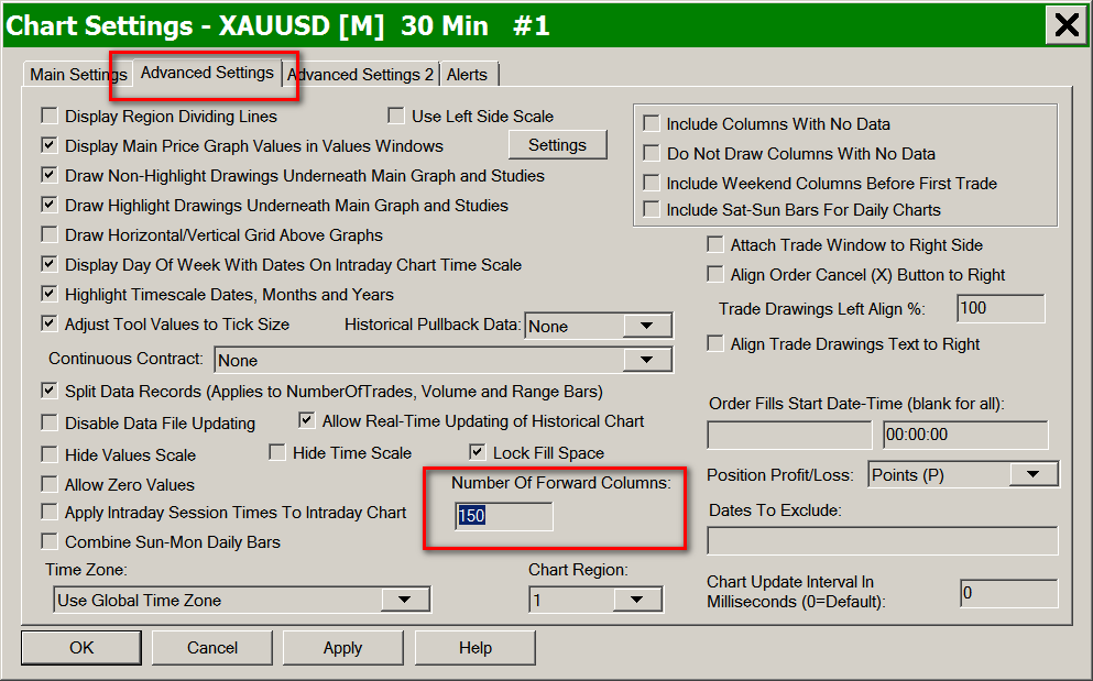 Under "Chart|Chart Settings|Main Settings" the "Do Not Load Weekend Data" and "Load Sunday Data" options are big improvements when drawing lines after a Friday close on the following Monday's charts. One does not run out of available fill space to the right with chart space allotted to Saturdays eliminated. "Number of Forward Columns": As to attempts to extend into fill space to the right and work (on a Friday, for example, as above) on charts beyond Monday, however, no matter how much I increase the number in the control for "Number of Forward Columns" under "Chart|Chart Settings|Advanced Settings" there is no effect whatsoever on the amount of fill space to the right made available. The "Lock Fill Space" control just above is unchecked - if that makes any difference. I can move only so far forward into the following week's charts, so I am wondering what exactly the control for "Number of Forward Columns" achieves. |
