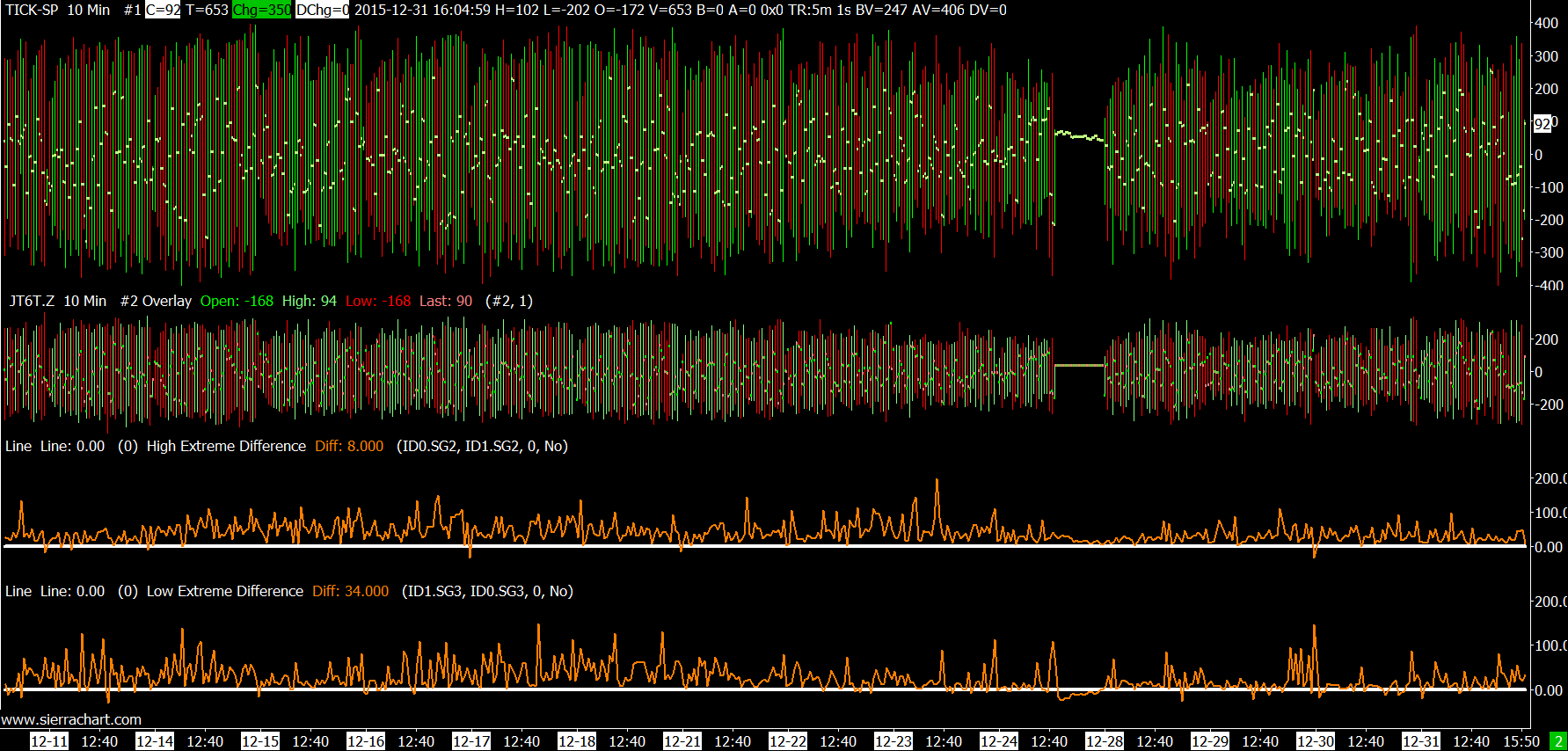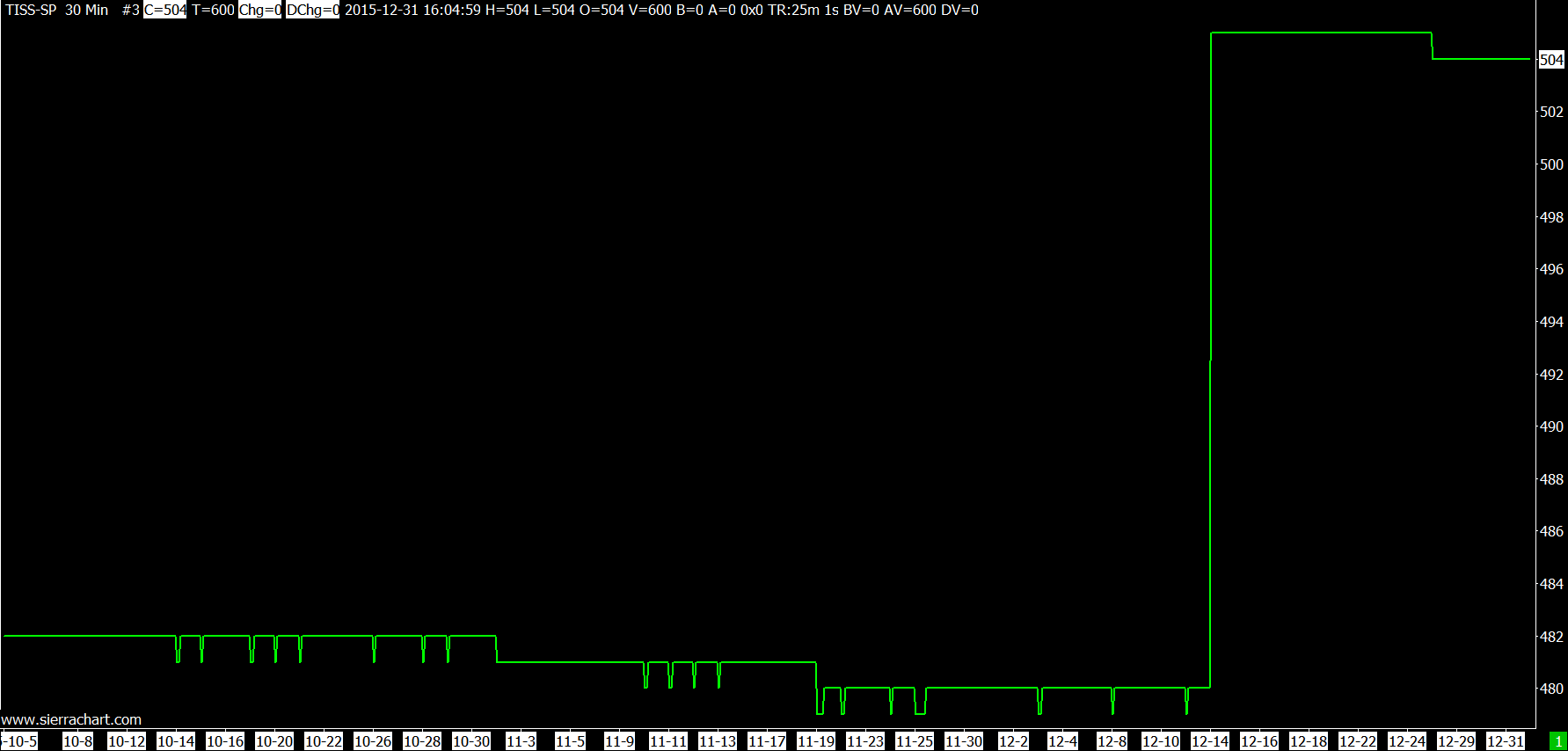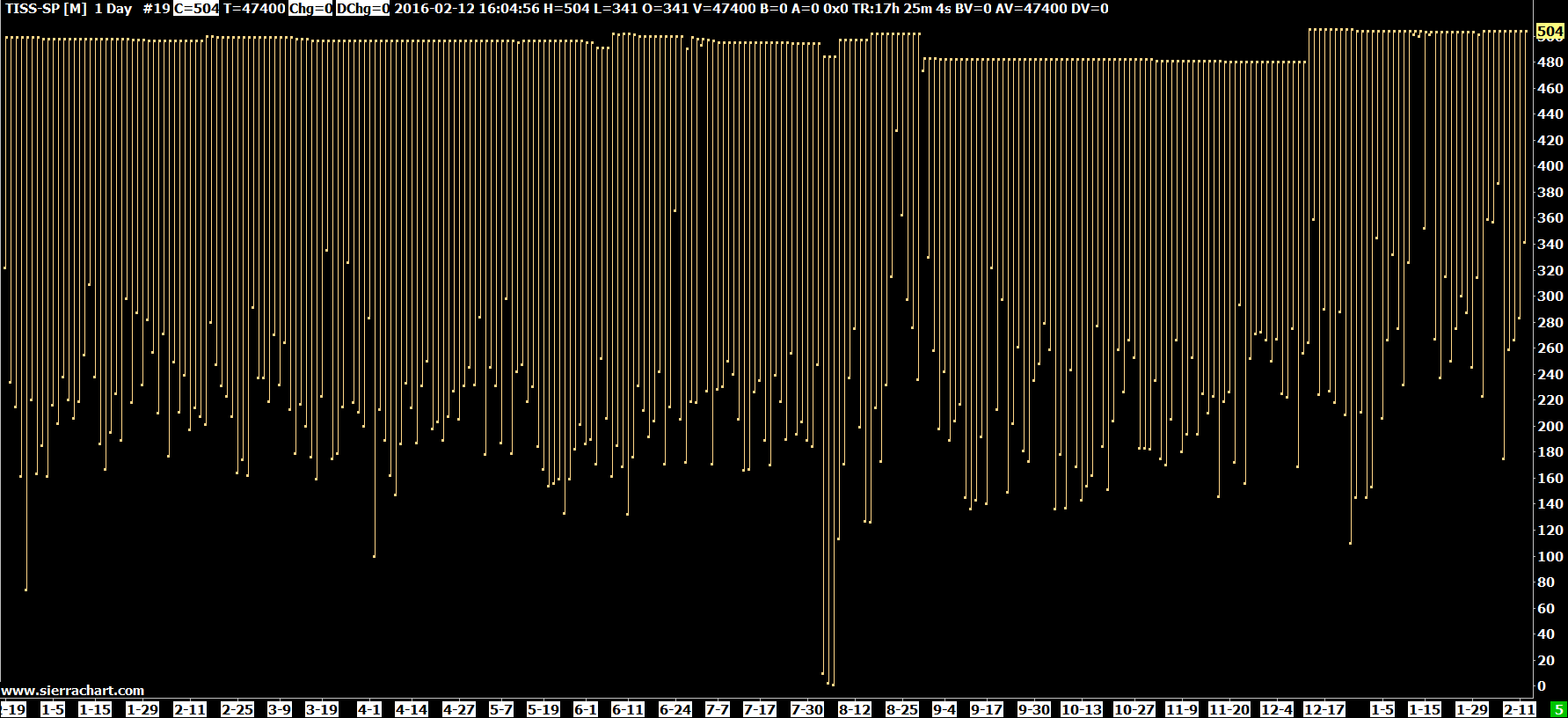 This is something we have mentioned in the article but we are only now paying more close attention to it: http://www.sierrachart.com/image.php?l=1451785554504.png This is a chart with two studies at the bottom showing that the extremes that the Sierra Chart calculated TICK for the S&P 500 stocks has are more than IQ Feed for the same S&P 500 TICK statistic symbol. What does this tell us? We are sure we are using the correct IQ Feed symbol because that is what they specify for their S&P 500 TICK symbol: http://forums.iqfeed.net/index.cfm?page=topic&topicID=3383 We cannot say with certainty, but the higher highs and lower lows, greater extremes, do indicate that Sierra Chart is delivering a much more complete data presentation. Sierra Chart does not use a sampling method but instead uses all trades of the S&P 500 stocks in the TICK calculation. This chart here indicates the number of stocks that are used in the S&P 500 TICK calculation: http://www.sierrachart.com/image.php?l=1451786374675.png It increases on December 14, 2015 but we still notice greater extremes with the SC calculated TICK for the S&P 500 before this date. You can easily validate this yourself by looking at the TICK-SP symbol. We will see why there is a jump at this date. Sierra Chart Support - Engineering Level Your definitive source for support. Other responses are from users. Try to keep your questions brief and to the point. Be aware of support policy: https://www.sierrachart.com/index.php?l=PostingInformation.php#GeneralInformation For the most reliable, advanced, and zero cost futures order routing, *change* to the Teton service: Sierra Chart Teton Futures Order Routing Date Time Of Last Edit: 2016-01-03 08:26:28