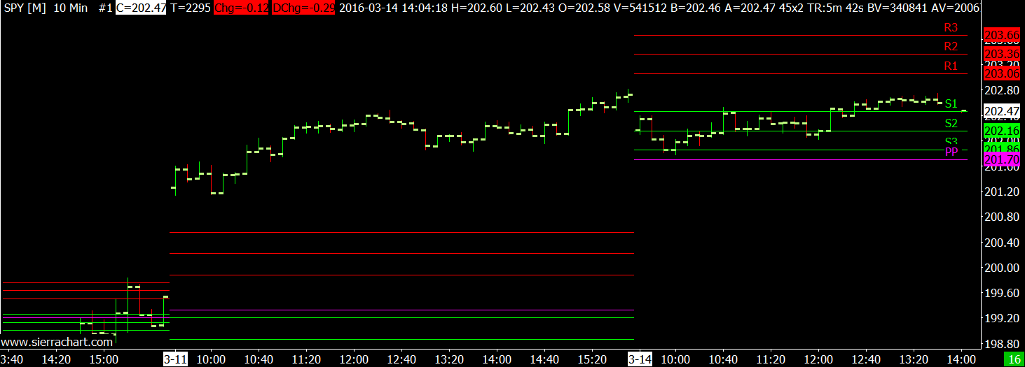 It works correctly for us: http://www.sierrachart.com/image.php?l=1457978661651.png Once again follow the instructions here to reference a Historical Daily Chart: http://www.sierrachart.com/index.php?page=doc/doc_PivotPoints.html#ReferenceDailyChartForData Sierra Chart Support - Engineering Level Your definitive source for support. Other responses are from users. Try to keep your questions brief and to the point. Be aware of support policy: https://www.sierrachart.com/index.php?l=PostingInformation.php#GeneralInformation For the most reliable, advanced, and zero cost futures order routing, *change* to the Teton service: Sierra Chart Teton Futures Order Routing |
