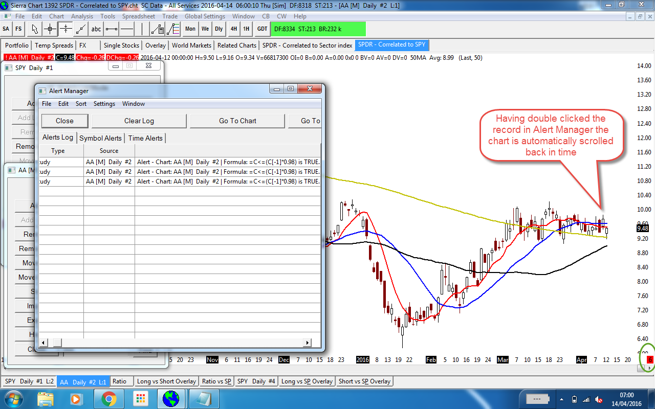 In the Alerts Window when I double click the record to take me to the chart it takes me to the time period when the condition is true so doenst appear to work from the "last" bar in th chart