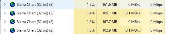 We tested a Chartbook you provided that had 4 charts in it, and on average CPU usage did not exceed 5%. This was with a 500 millisecond update. The four charts were tiled across a 1920 by 1080 resolution monitor. So that is a significant difference right there. Sierra Chart Support - Engineering Level Your definitive source for support. Other responses are from users. Try to keep your questions brief and to the point. Be aware of support policy: https://www.sierrachart.com/index.php?l=PostingInformation.php#GeneralInformation For the most reliable, advanced, and zero cost futures order routing, *change* to the Teton service: Sierra Chart Teton Futures Order Routing |