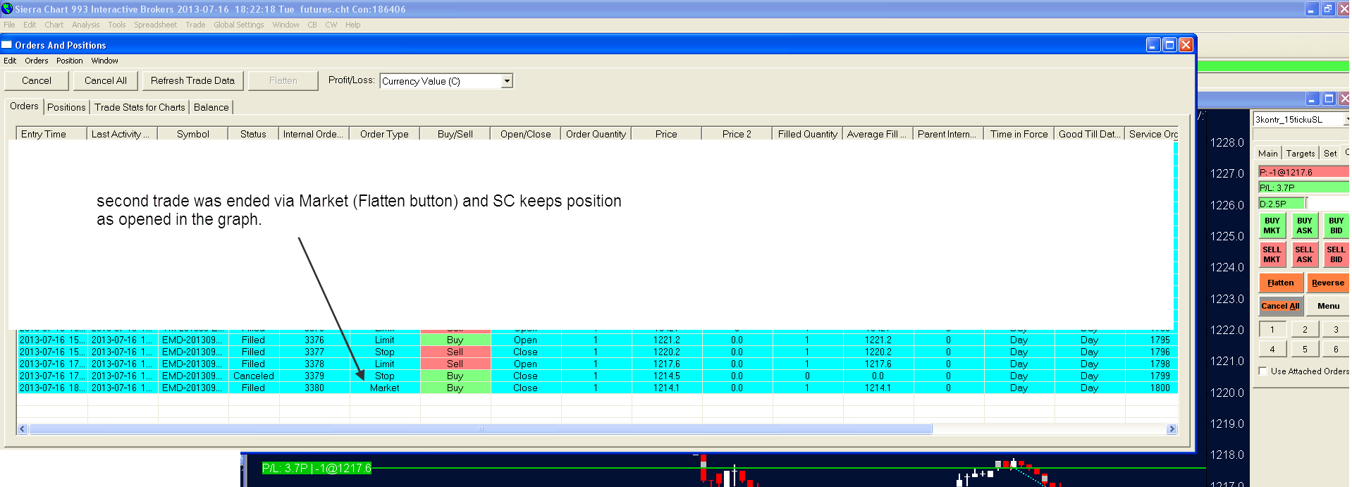 Hello, Yes the problem is still in the software. But now I know it happens only if I end the position via market (using the Flatten button). If the position ends via limit or stop order, it ends correctly. Have a look at included screenshots: Sierra prints the nonexisting short positions in the Positions tab (altough in IB the position is already flat), but in the same time Sierra is flat under Trade stats for Charts! If I refresh the tab via „Refresh Trade Data“ nothing happens. I have to get rid of the position only via menu Position > Clear Selected Position Data. Please send me en email If you want to check it remotely. But how can you check it? This only happens while realtime trading .... |