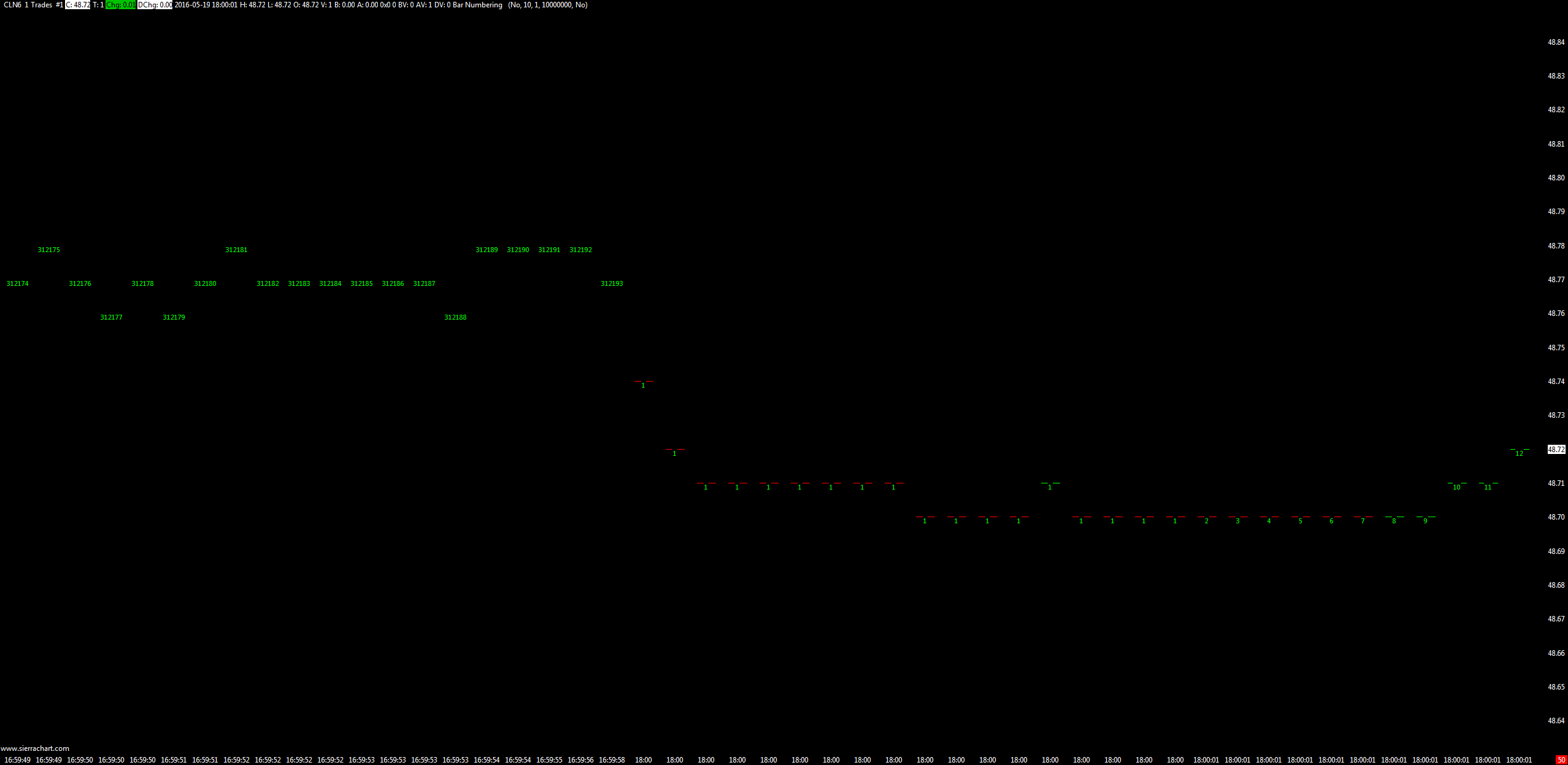 There is a slight inaccuracy present on the current CLN6 contract when using the Bar Numbering Study with a 1_range or 1_tick chart with the start time set at 18:00:00. Please see attached from 5-19-2016. |