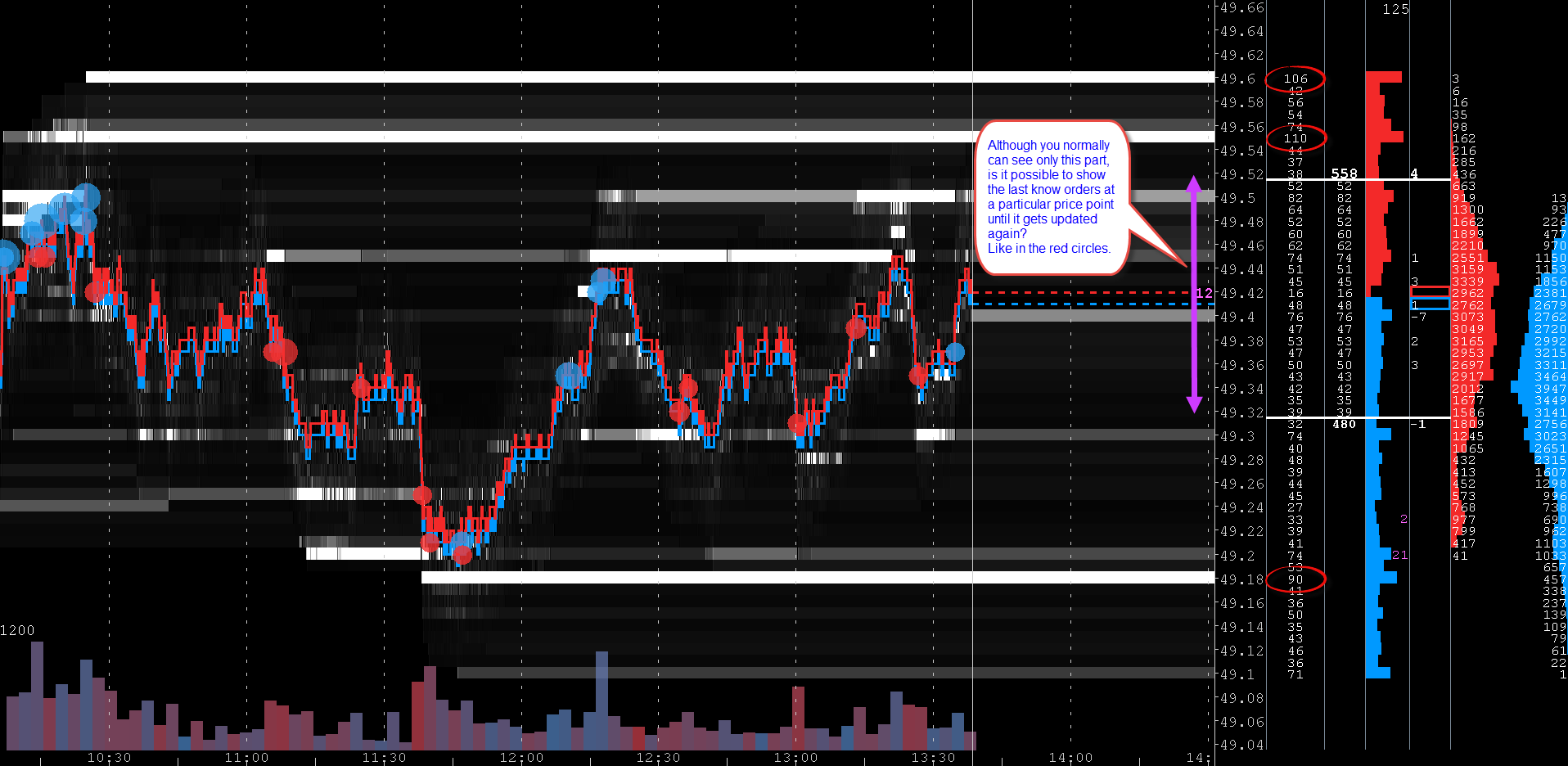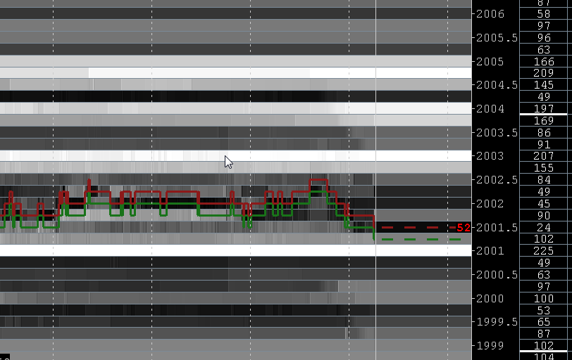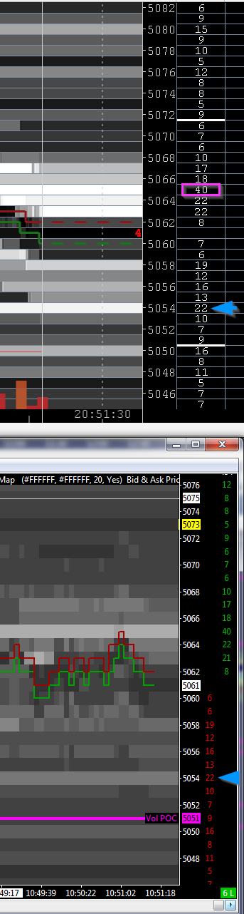 Here is a current picture of Bookmap Having a closer look it seems they are ranking the volume by shading. Look at 49 (white) and the 25 and 27 are close to white. Anybody have more info? |