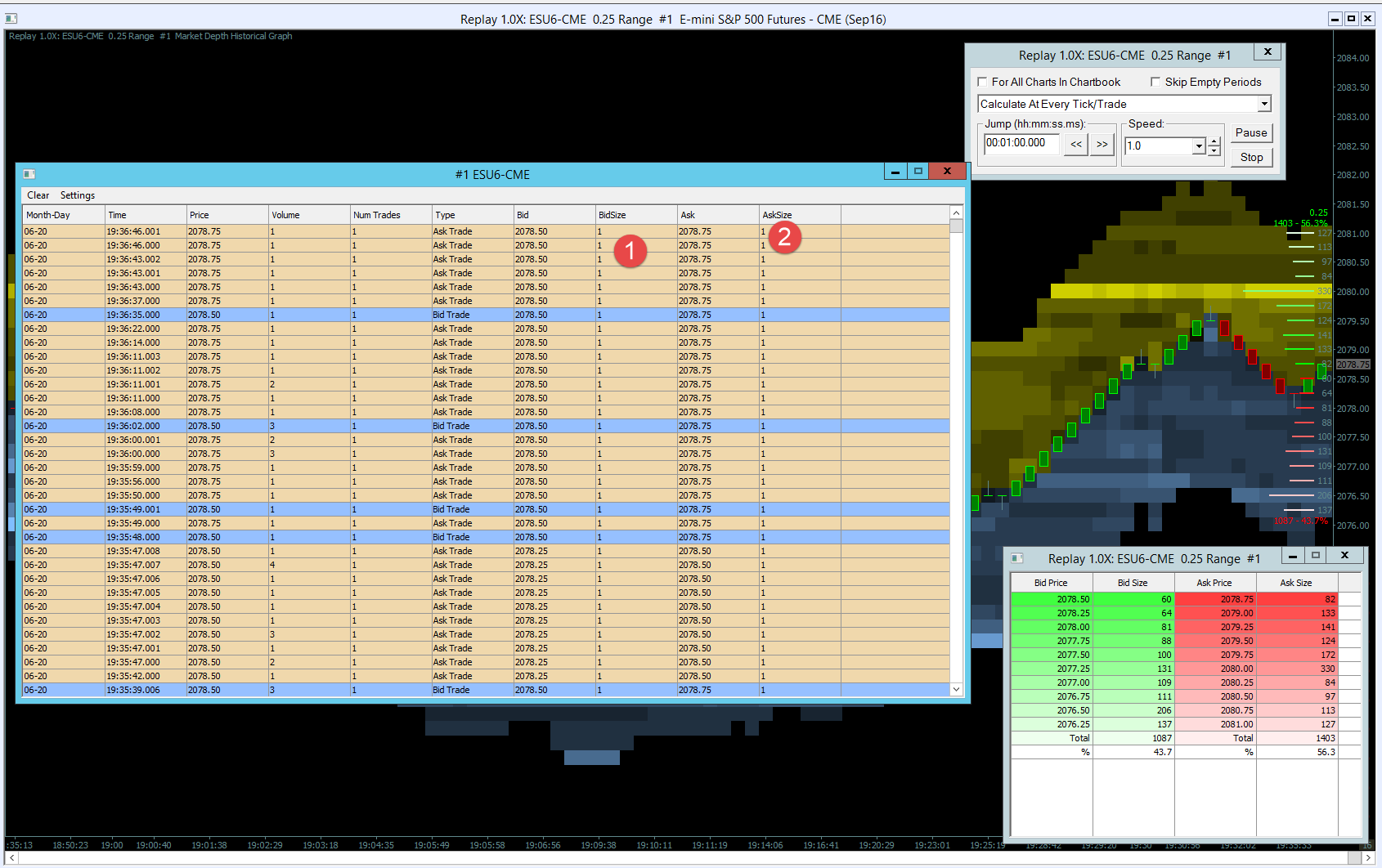 SC Team - the latest addition of historical depth is really a great feature. Have been waiting for this native to sierra for a very long time. Everything is working great except for AskSize/BidSize in T&S window during replay (marked 1 & 2). Attached is the image. Thanks |