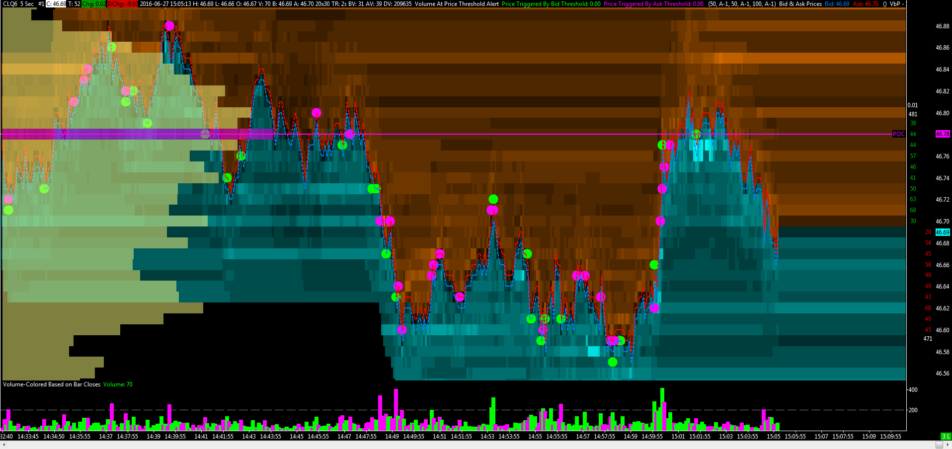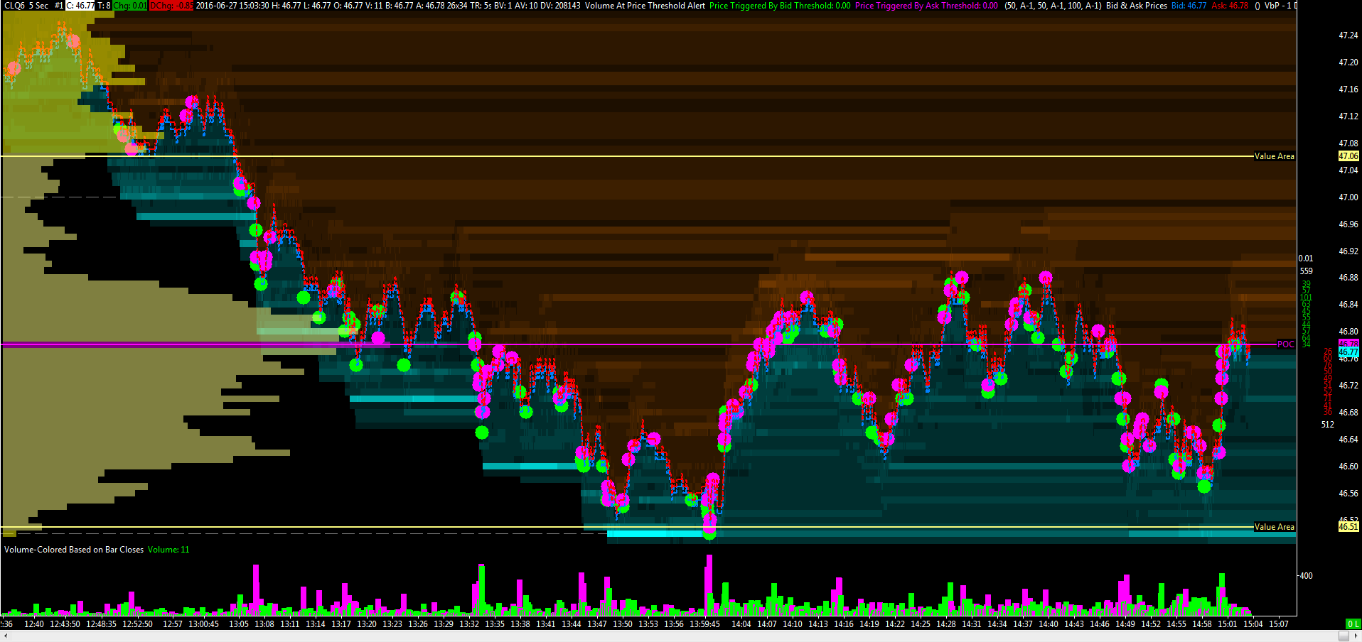 I found a study where you can replicate(more or less) the Volume Dots you have on BookMap. The study is called Volume At Price Treshold Alert. It can look something like this: |