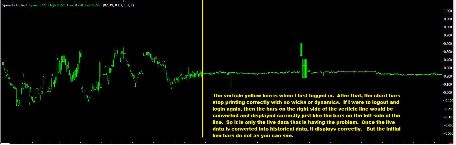 I'm following up once again on the issue mentioned above from last year to check the status. My entire trading strategy revolves around using your various Difference, Sum all charts, and Spread 4 indicators, etc. Unfortunately for me I can't use the software until this is fixed. Can you please explain why this occurs and what the cause of this issue is? Because it is impossible to analyze symbols if the live data retraces/disappears and is not printing or retaining most of the bar's visual information on the chart (see attached screenshot). One additional note that may be helpful. The problem doesn't seem to be about creating custom spread symbols as you mentioned above. For example the Spread 4 Indicator seems to be fine the way it is set up for inputting various symbols. Instead, the problem is the way the actual chart functions and prints the data. Live data bars retrace and do not print the wicks of the bar so most of the bar's dynamic range is missing; making the bar incomplete. If you logout and log back in, those same bars will show the full dynamic range. Thanks again. Any response is appreciated because I can't trade without this one issue being resolved. Date Time Of Last Edit: 2018-12-04 07:30:05