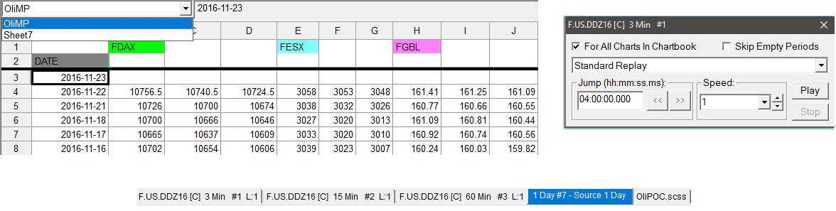 I create the spreadsheet "OLIPOC". Every day I am writing new data in the sheet "OliMP". Sheet7 is "connected" with "OliMP" and the the are running in Chart #7 (1Day). If I like to run a replay the data of the sheet "OliMP" do not run back. It would help, if there would be a second choice to run more than one charts back: 1. For all Charts in Chartbook 2. For selected Charts in Chartbook (in my case i.e. #1, #2, #3) Or is there an other way to use replay and my "manual" sheet (OliMP) is going back too. |