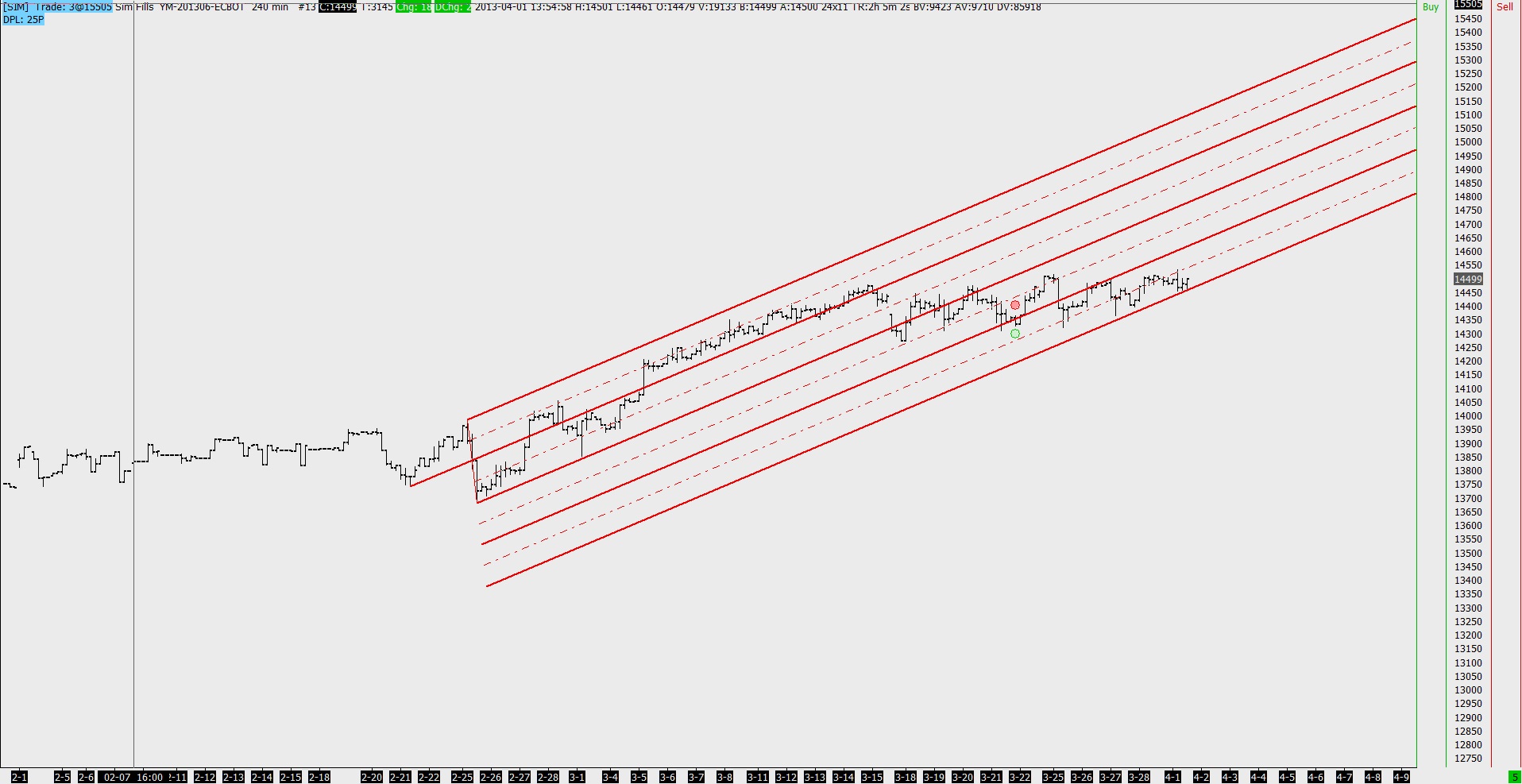 I'm a regular user of Andrews Pitchforks (as well as Schiff and Modified Schiff Pitchforks) and am having an issue with the forks changing slope significantly when small changes are made to horizontal or vertical scale. Below are a couple of examples of the variations cause by a slight change in the price scale. Chart 1.jpg shows a Andrews Pitchfork with multiple parallels. Note that the final bar is touching the lower pitchfork parallel. The pitchfork line and final bar intersect at about 14461 on the Y axis. Chart 2.jpg shows the same chart with a slight change made to the price scale by clicking on the scale and moving the mouse slightly. On this chart the bottom parallel has shifted by around 40 points in relation to the last bar. The low of the last bar remains at 14461, but the parallel has moved down to about 14421. When there are more bars between the pitchfork's origin points and the bar of interest the variations become even greater making the pitchforks of little use in many instances. In addition, the same kinds of pitchfork slope variations occur when changing the bar spacing and sometimes when simply scrolling right or left on the chart. Please let me know if you'd like me to provide screen captures of these instances. Is there any way this can be fixed or the severity of the variation in slope reduced? Date Time Of Last Edit: 2013-04-01 21:23:53