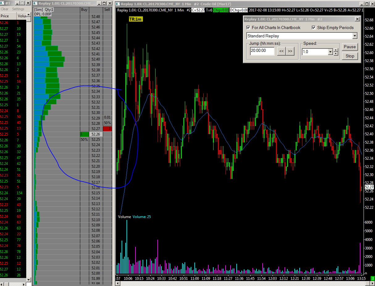You need to follow through the instructions here to do what you require: http://www.sierrachart.com/index.php?page=doc/ReplayChart.html#ReplayingTradeDOM Sierra Chart Support - Engineering Level Your definitive source for support. Other responses are from users. Try to keep your questions brief and to the point. Be aware of support policy: https://www.sierrachart.com/index.php?l=PostingInformation.php#GeneralInformation For the most reliable, advanced, and zero cost futures order routing, *change* to the Teton service: Sierra Chart Teton Futures Order Routing |